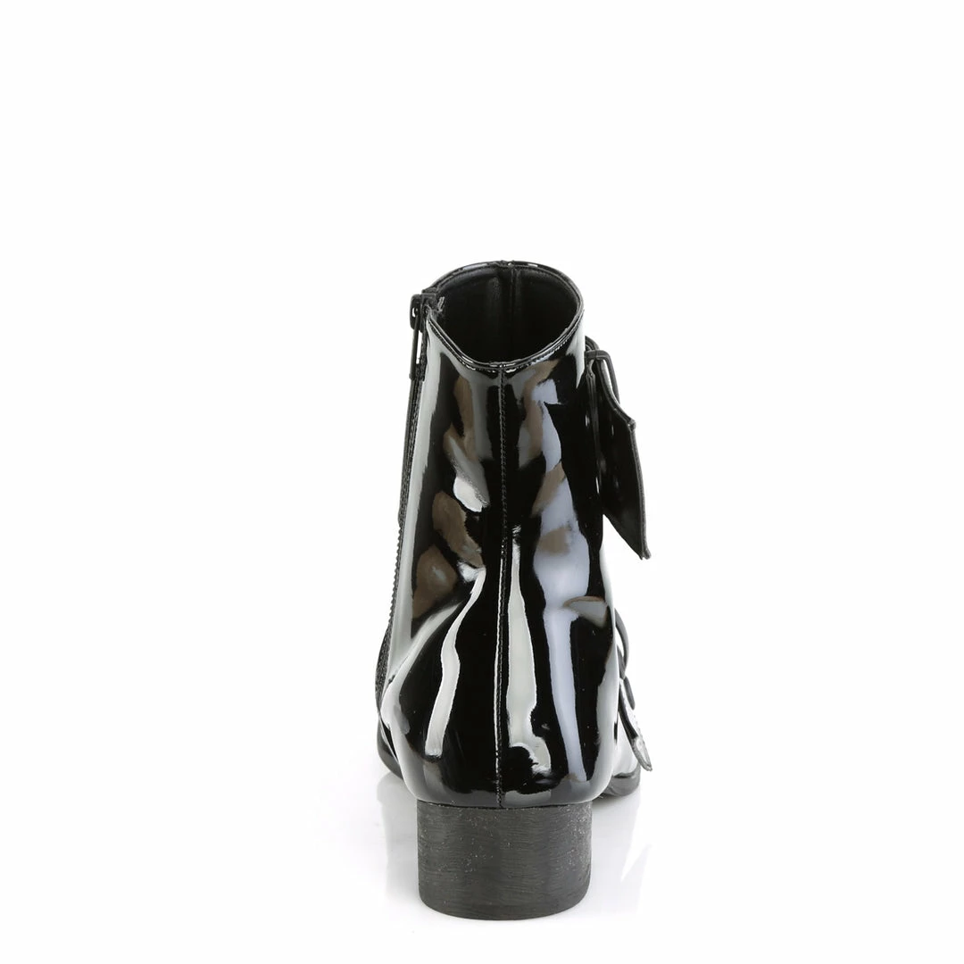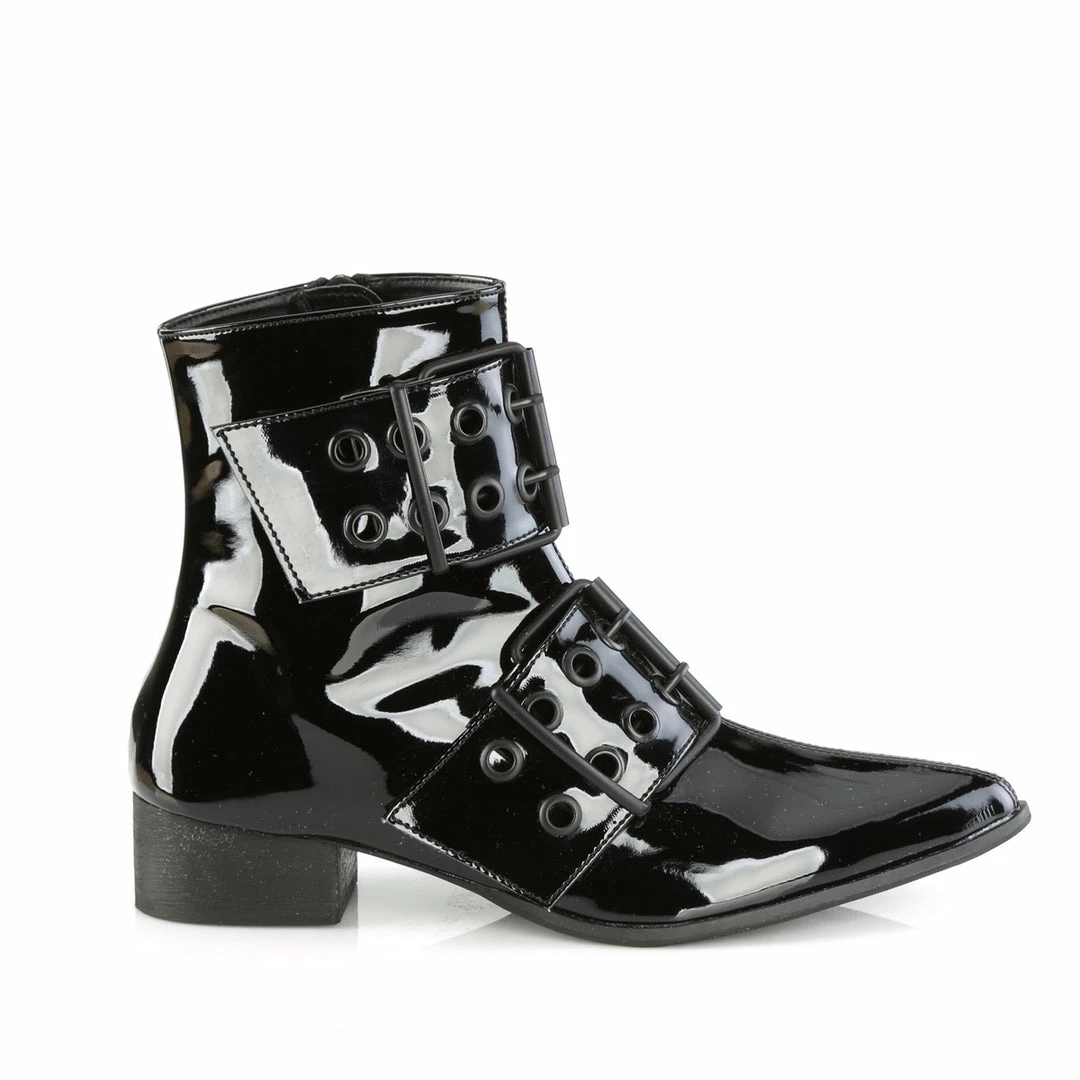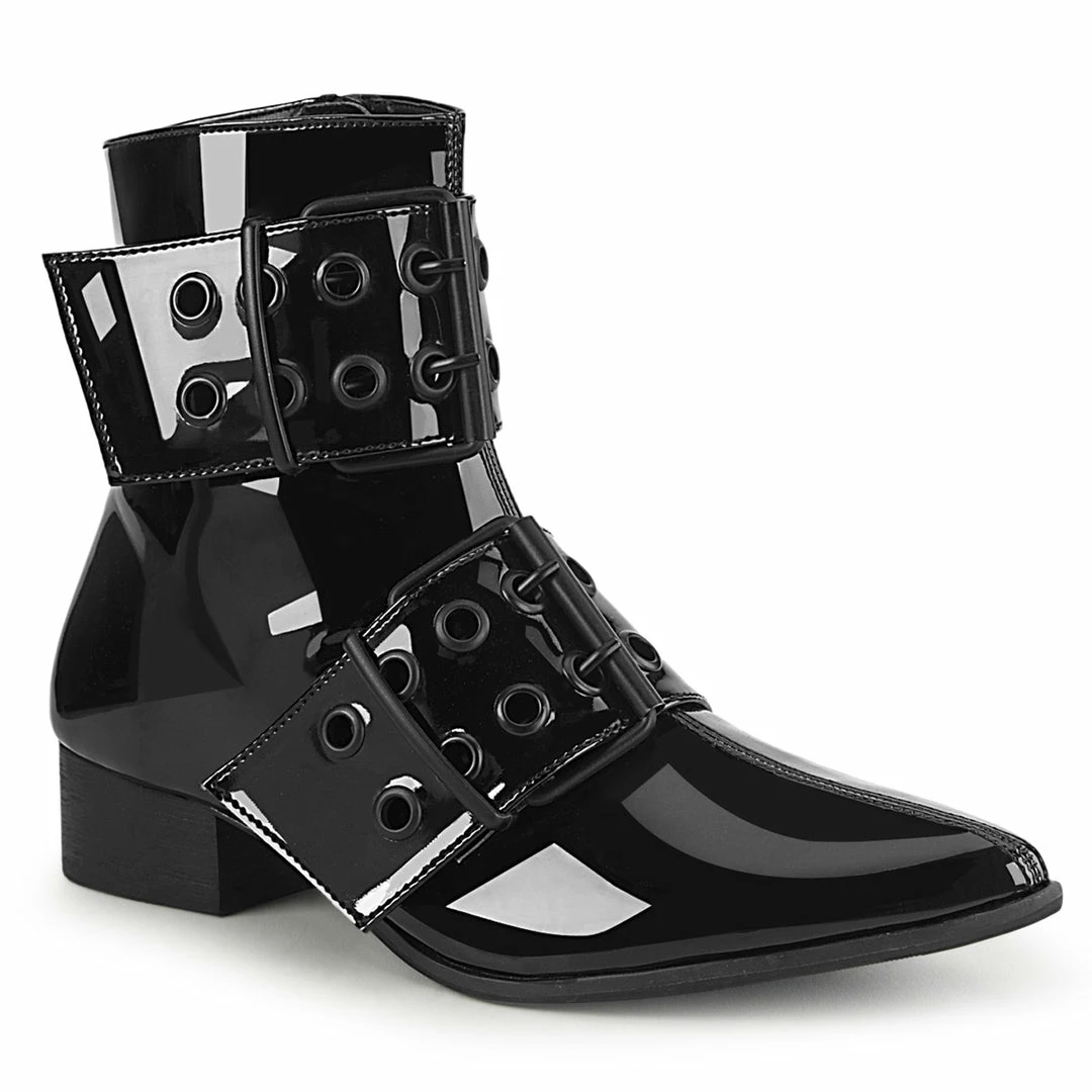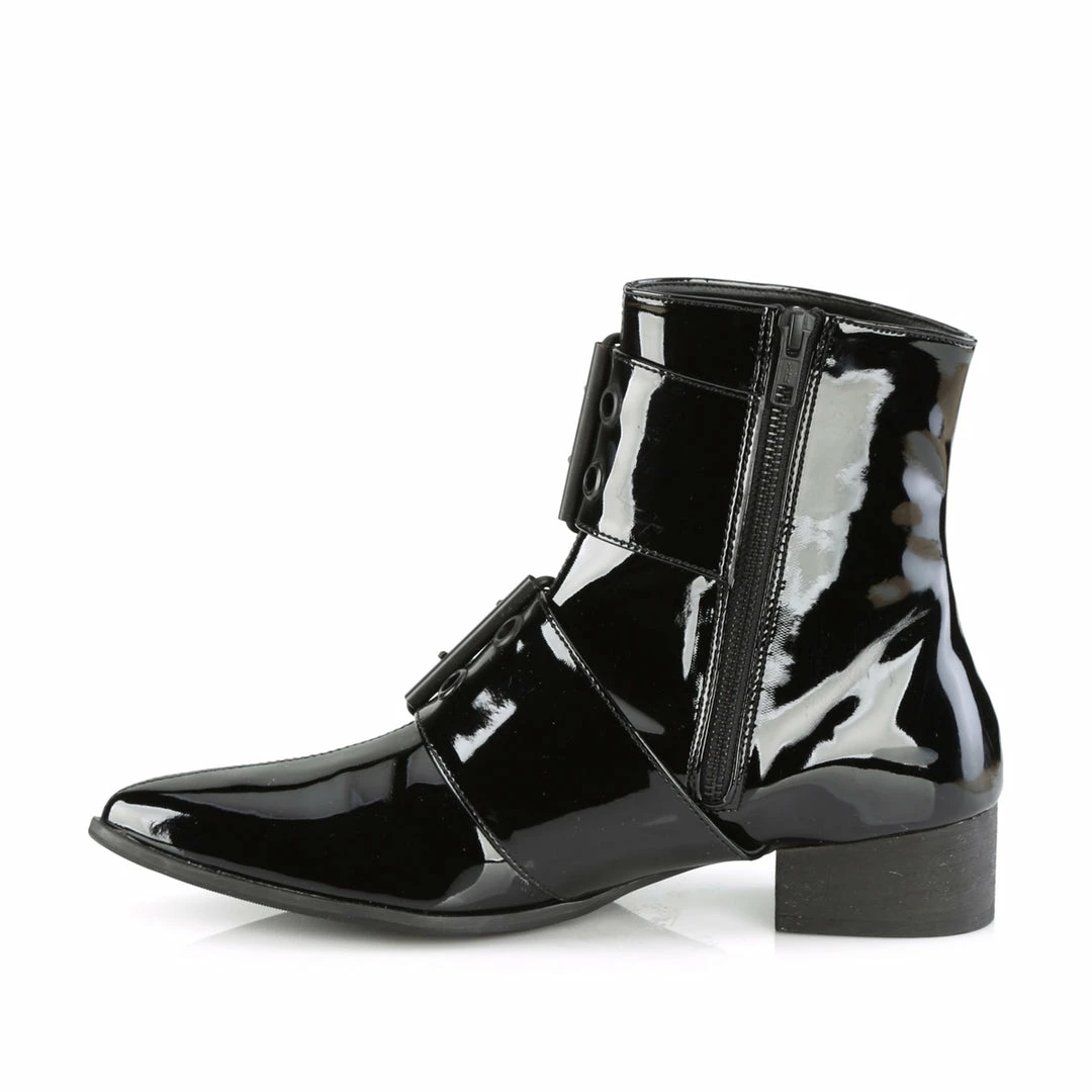1 1/2″ (38mm) Block Heel Pointed Toe Winklepicker Style Ankle Boot Featuring Double Grommet Buckle Straps, Inner Side Zip Closure