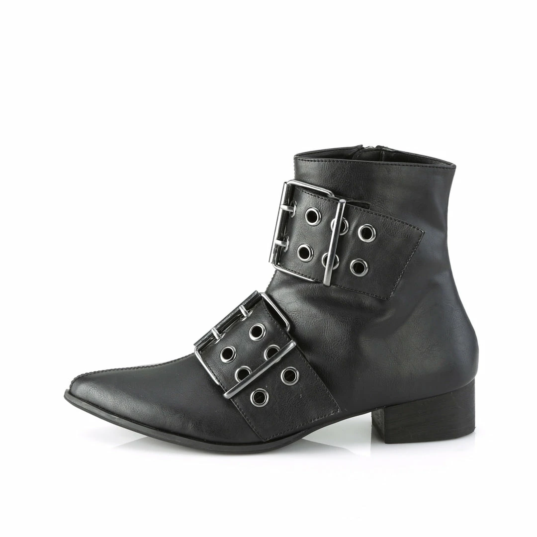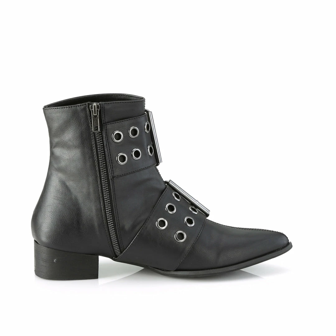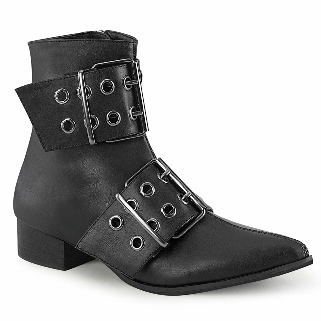 1 1/2″ (38mm) Block Heel Pointed Toe Winklepicker Style Ankle Boot Featuring Double Grommet Buckle Straps, Inner Side Zip Closure