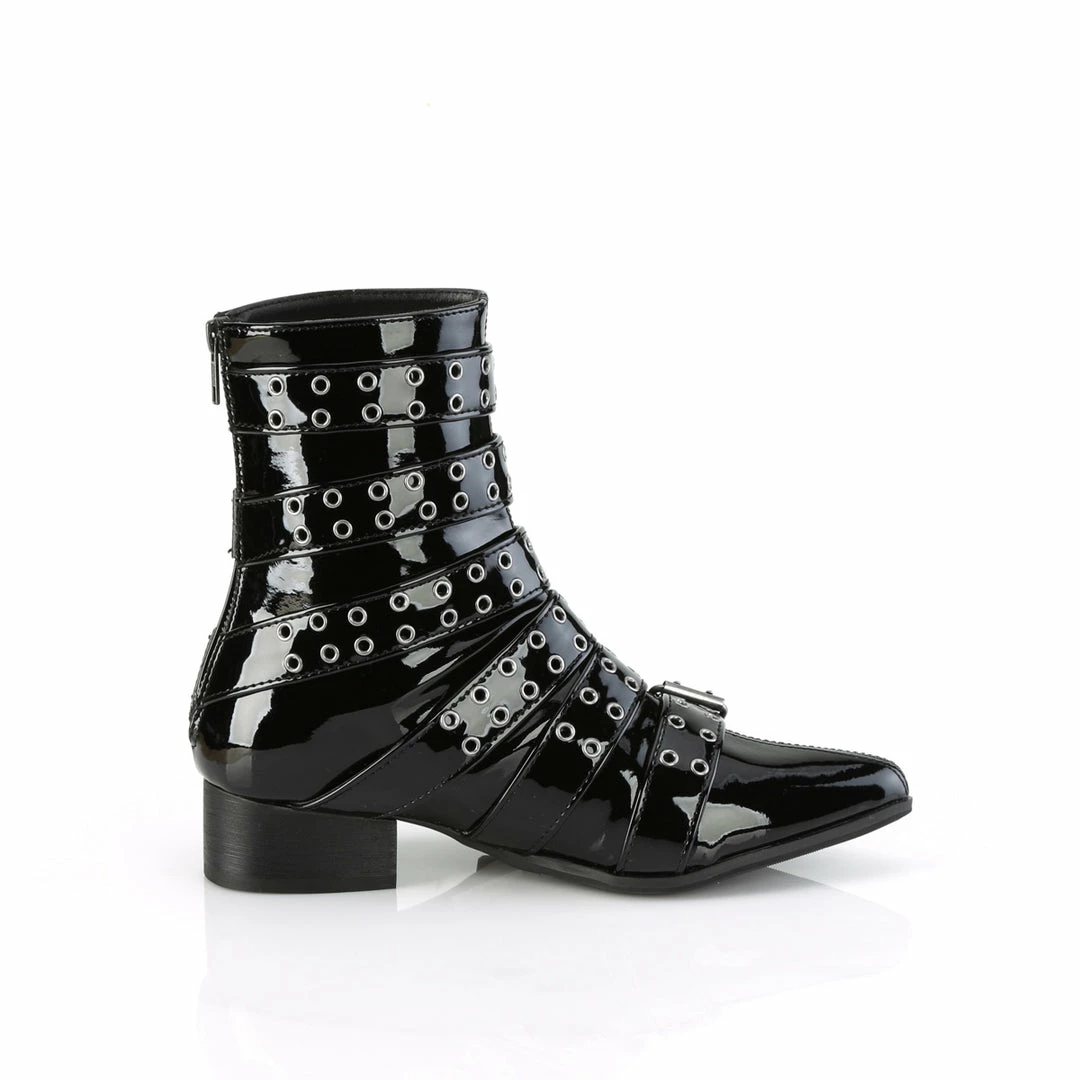 1 1/2″ (38mm) Block Heel Pointed Toe Winklepicker Style Calf High Boot Featuring Multi Double Grommet Buckle Straps, Back Zip Closure