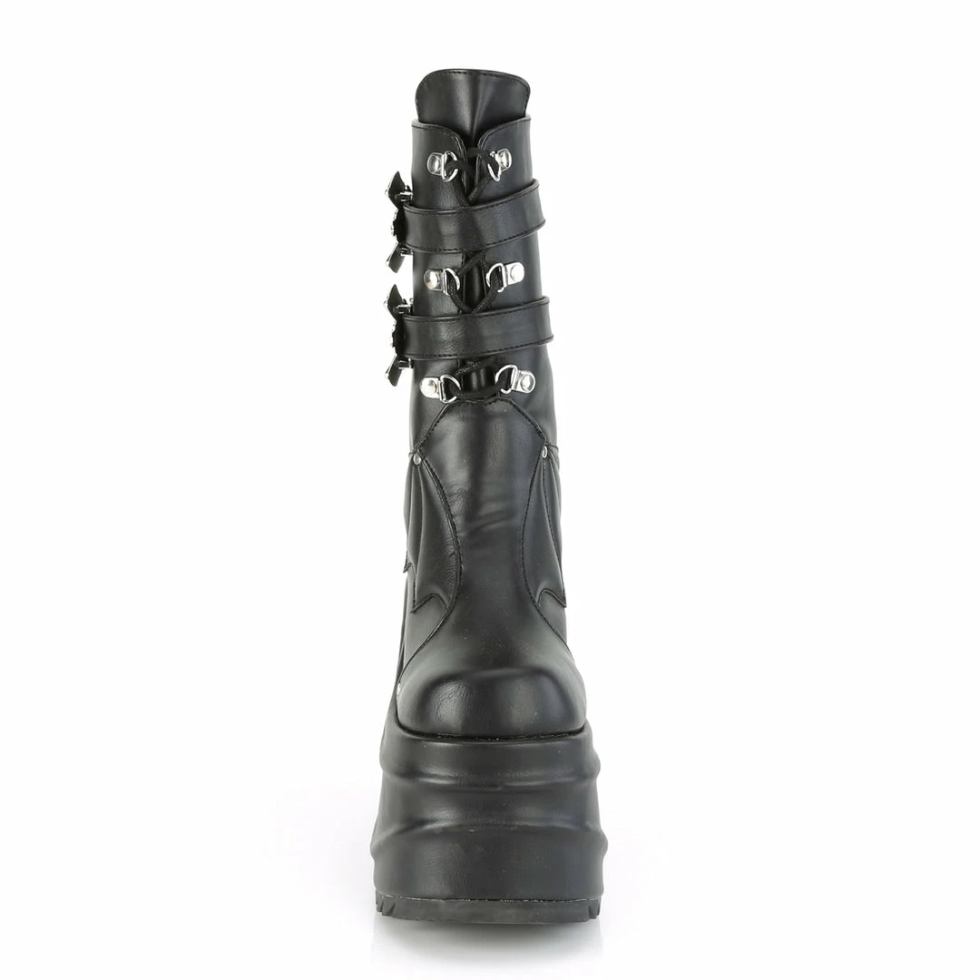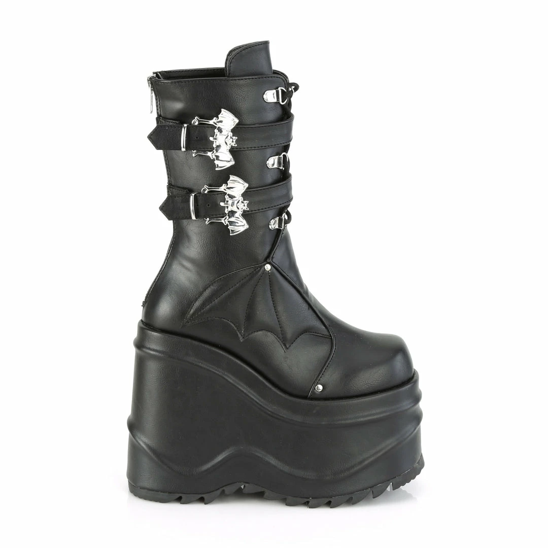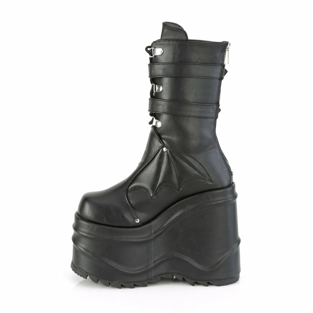 6″ (152mm) Wedge Platform Lace-Up Mid-Calf Boot featuring Quilted Bat Wings Design on Vamp & Dual Bat Buckle Ankle Straps, Back Metal Zip Closure