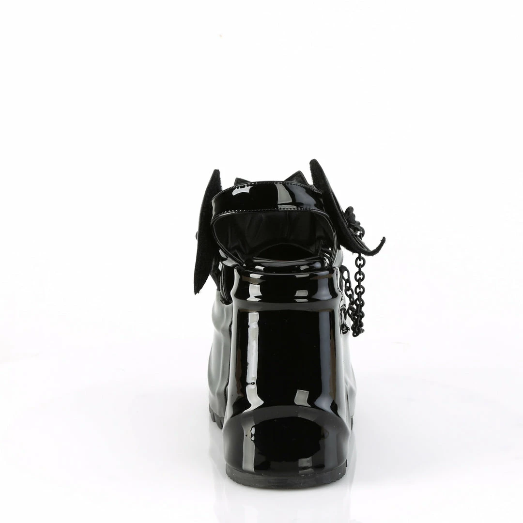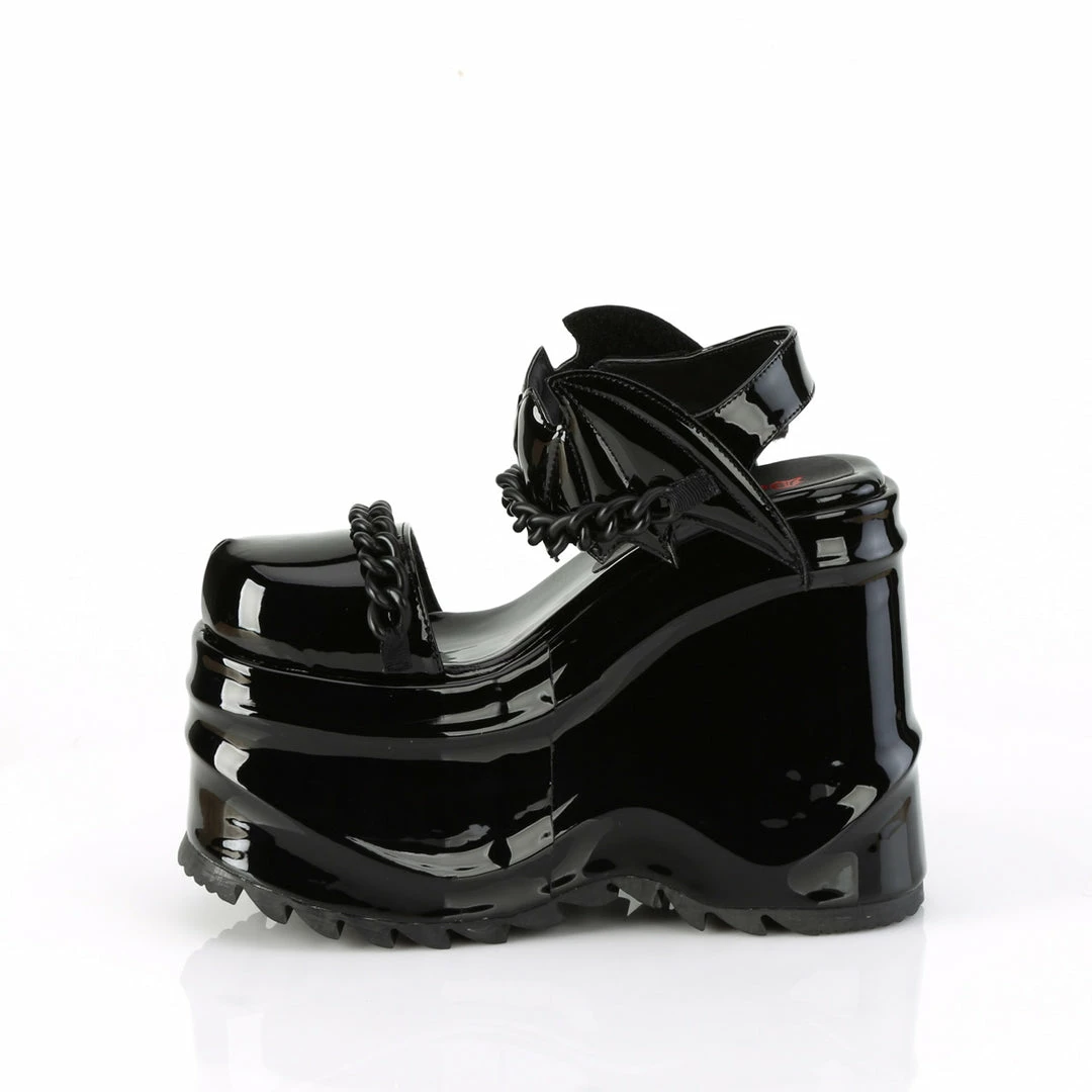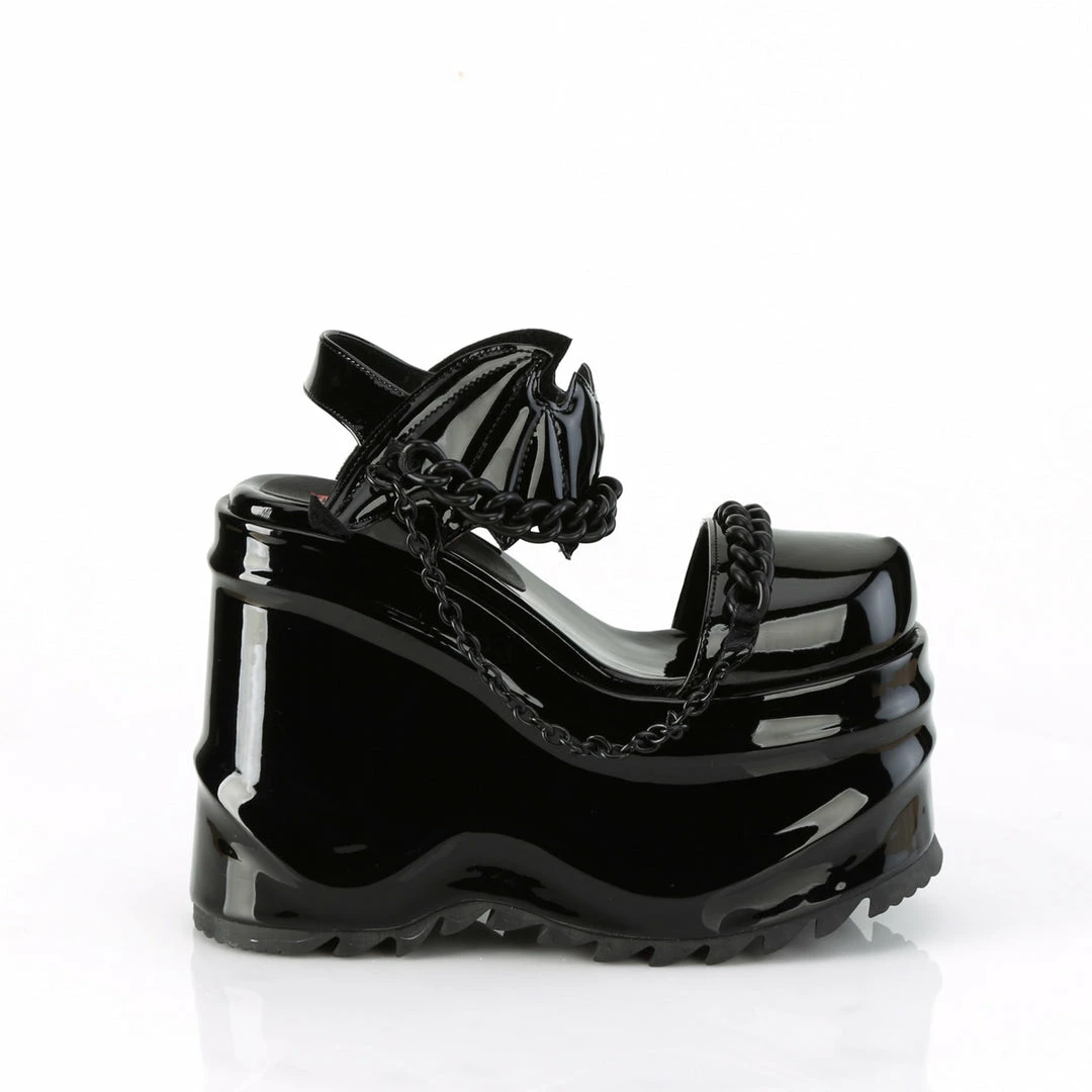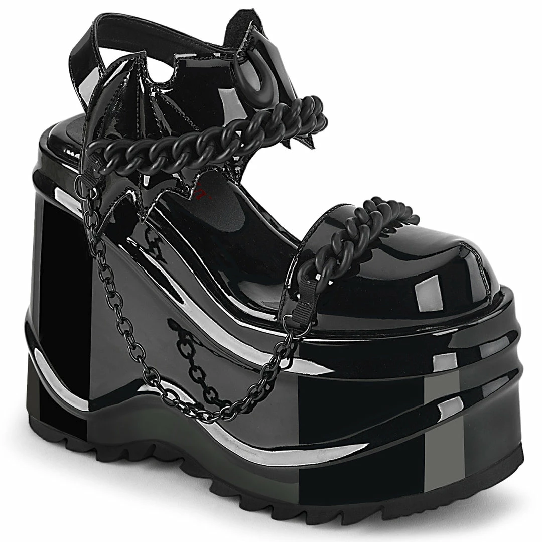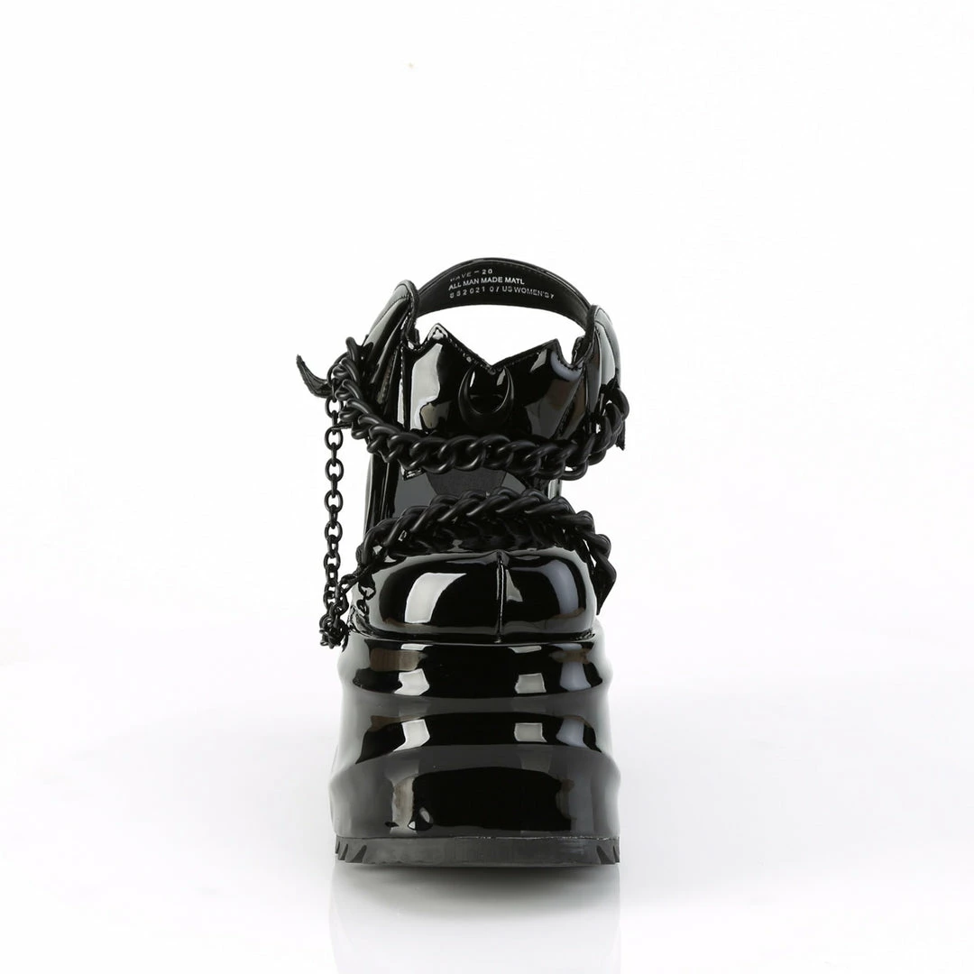 6″ (152mm) Wedge Platform Close Toe Ankle Strap Sandal Featuring Bat Shaped Hook & Loop Ankle Strap Closure, Moon & Chain Details