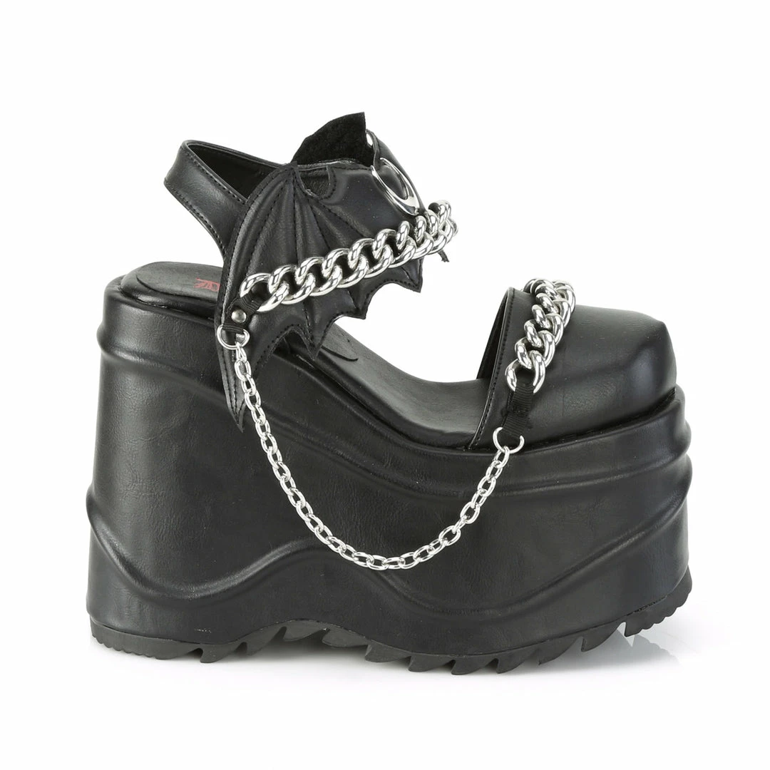 6″ (152mm) Wedge Platform Close Toe Ankle Strap Sandal Featuring Bat Shaped Hook & Loop Ankle Strap Closure, Moon & Chain Details