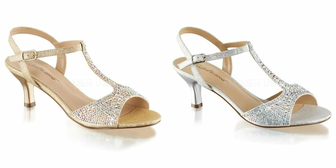 2 1/2″ (6.4cm) Kitten Heel T-Strap Sandal Embellished with Slv Multi Rhinestones Shimmering Fabric