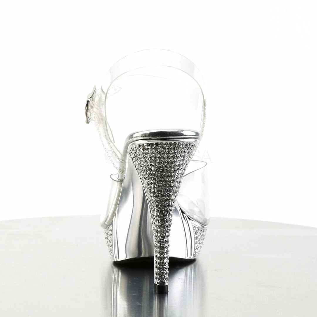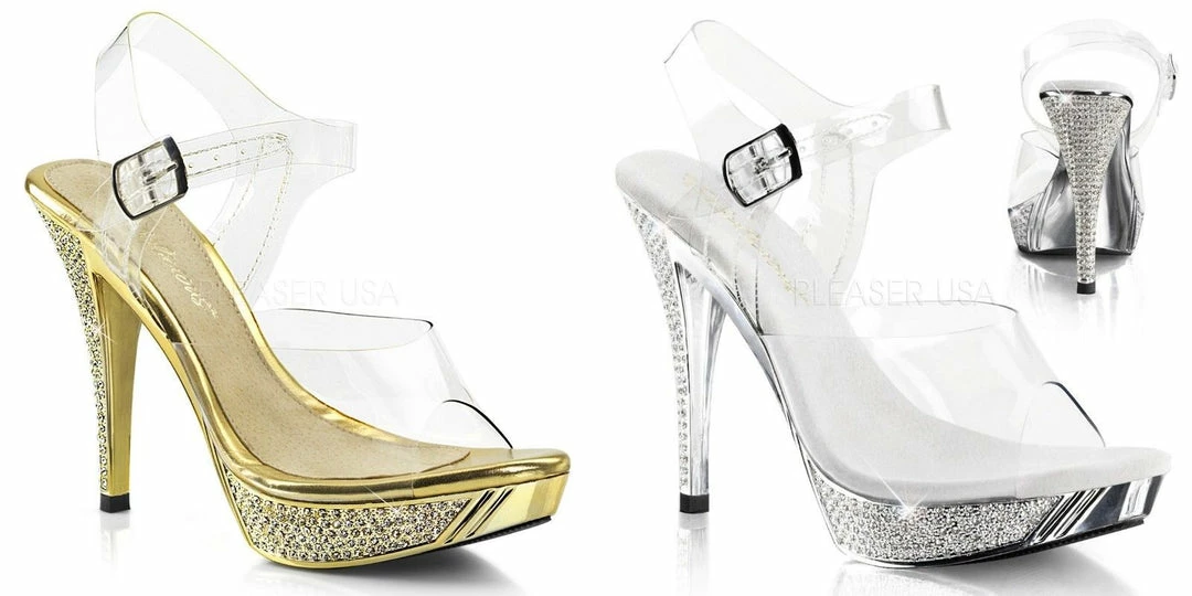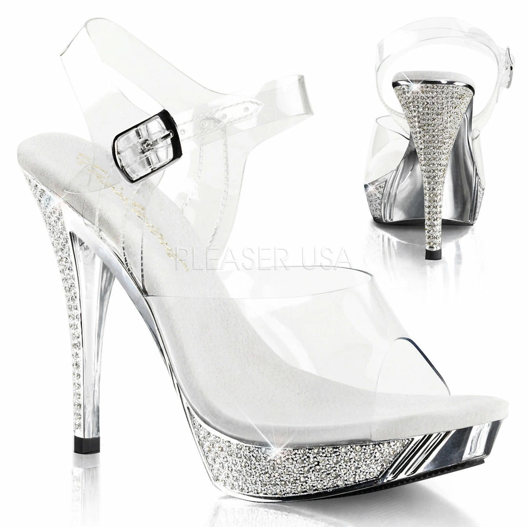 4 1/2″ (11.4cm) Heel, 1″ (2.5cm) Platform Ankle Strap Sandal Featuring Rhinestone Embellished Heel and Platform