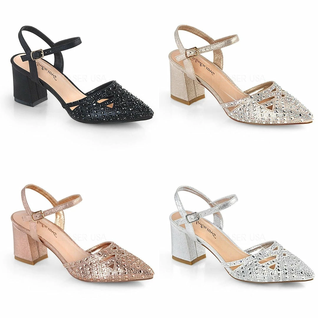 2 3/4″ (70mm) Block Heel Pointed Toe Open Back Ankle Strap Pump w/ Rhinestone Studded Vamp