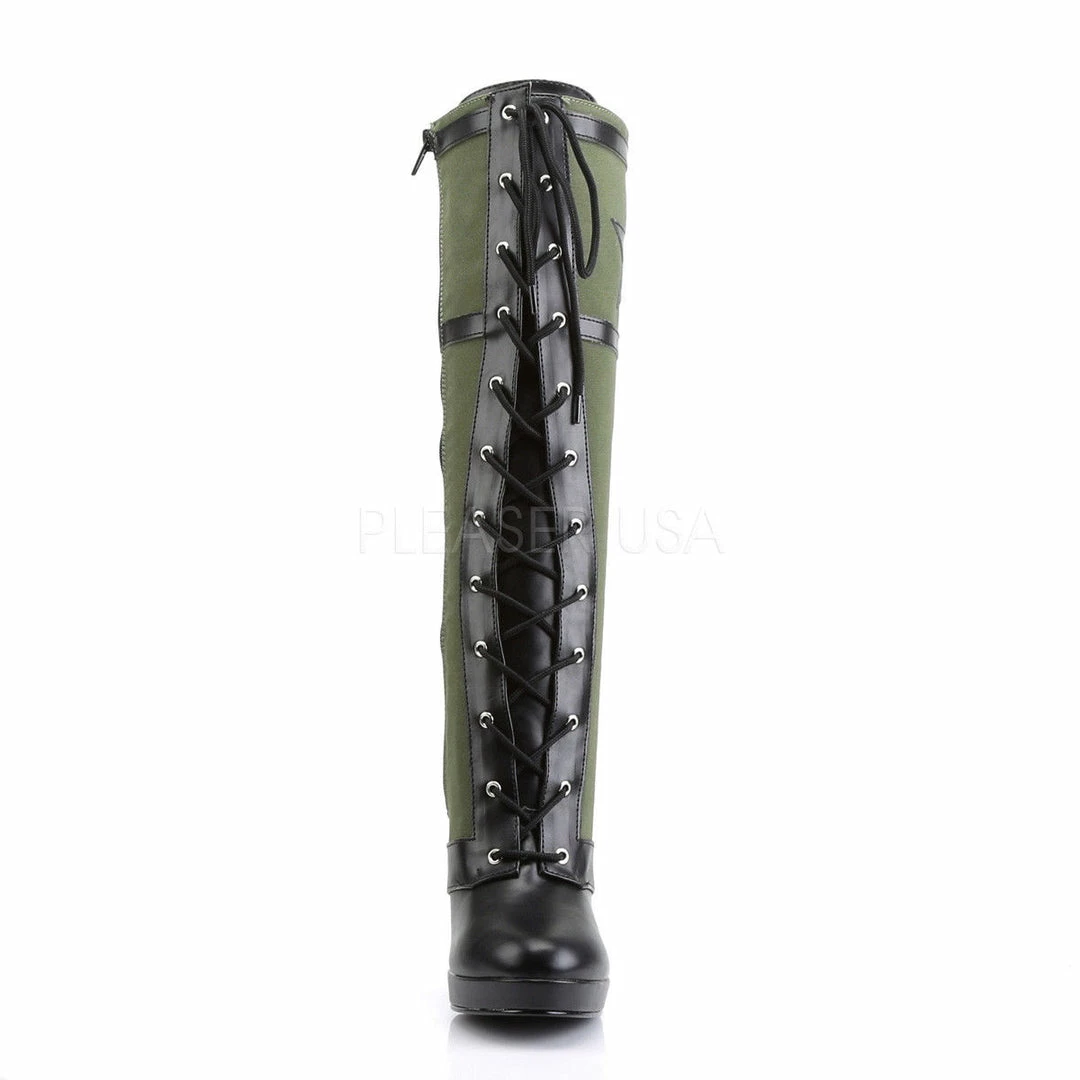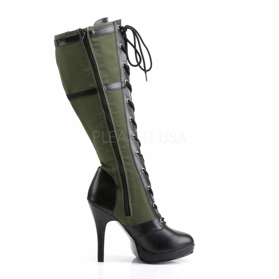 4 1/2″ (11.4cm) Heel Front Lace Up Knee High Military Boot with Star and Stripes Detail, Full-Length Inside Zip Closure
