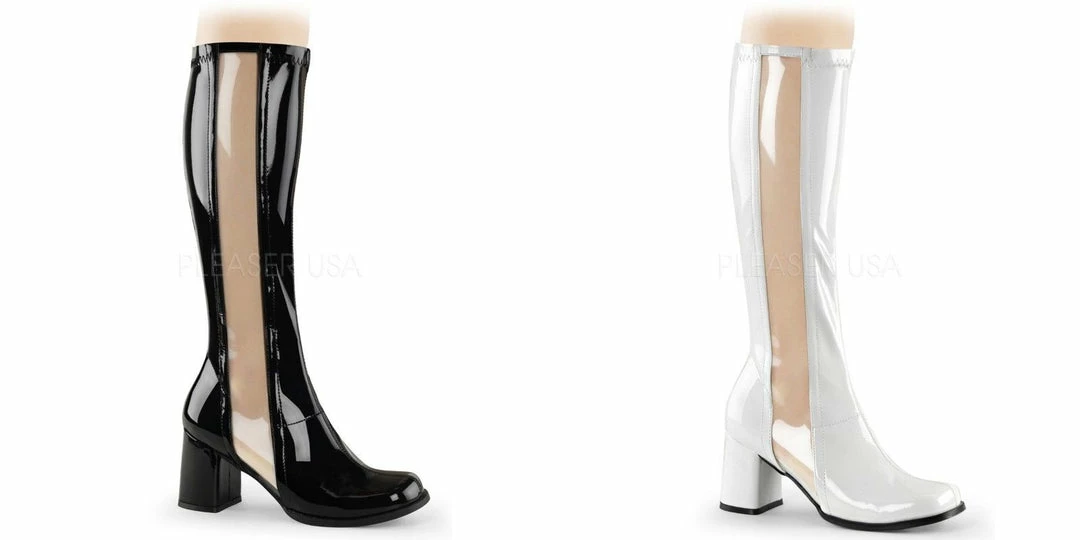 3″ (7.6cm) Block Heel Gogo Boot, Stretch Patent, with Transparent Stripe On the Outer Side, Full-Length Inside Zip Closure