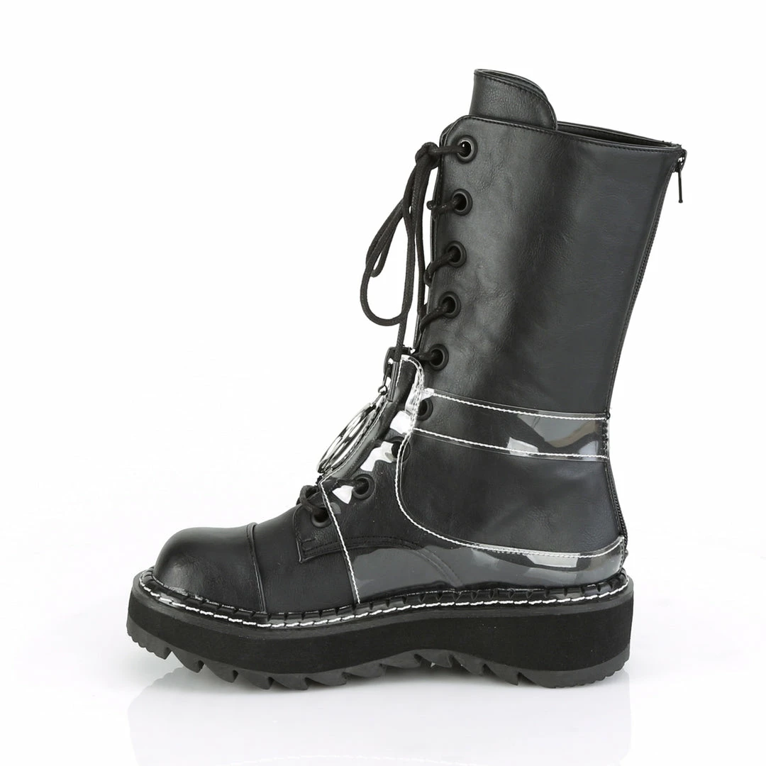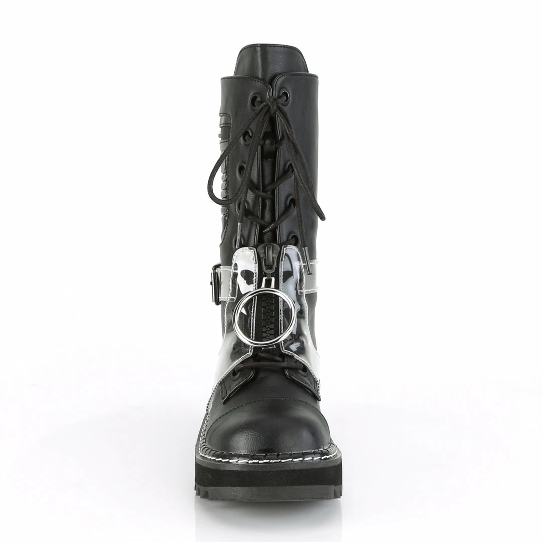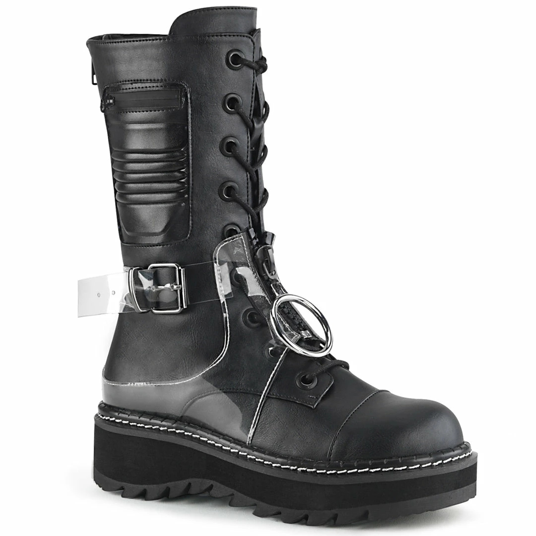 1 1/4″ (32mm) Platform Lace-Up Mid-Calf Boot Featuring Outside Zip Closureed Pocket & Transparent Harness w/ Zip Closureed Front & Oversized O-Ring Zip Closure Pull, Back Zip Closure