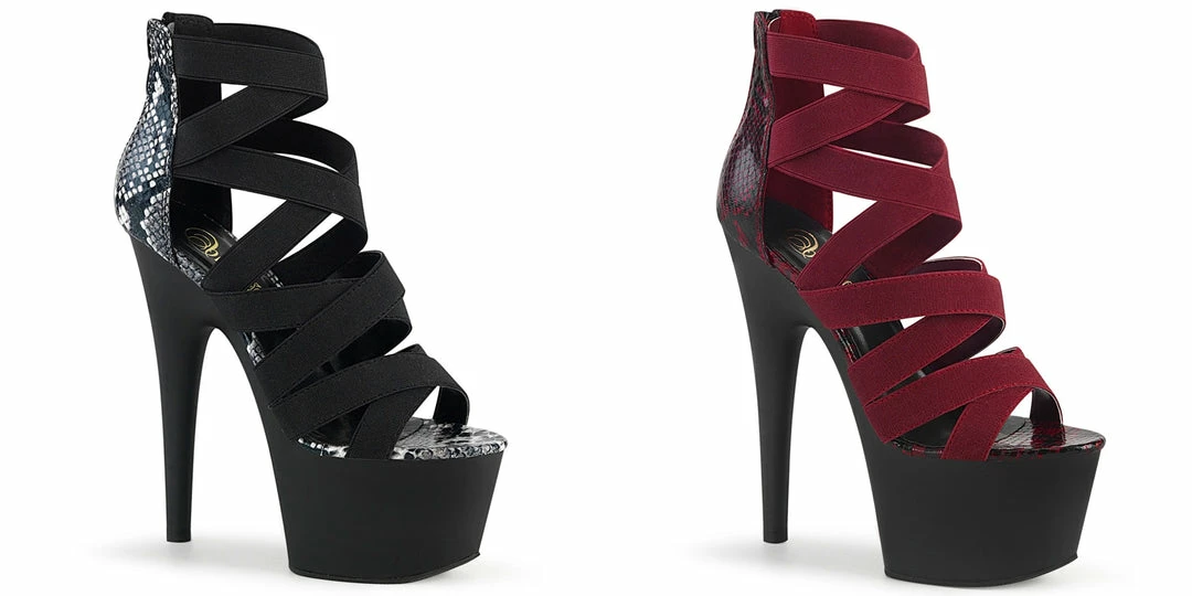 7″ (178mm) Heel, 2 3/4″ (70mm) Platform Close Back Sandal w/ Multiple Criss Cross Elastic Straps, Back Zip Closure