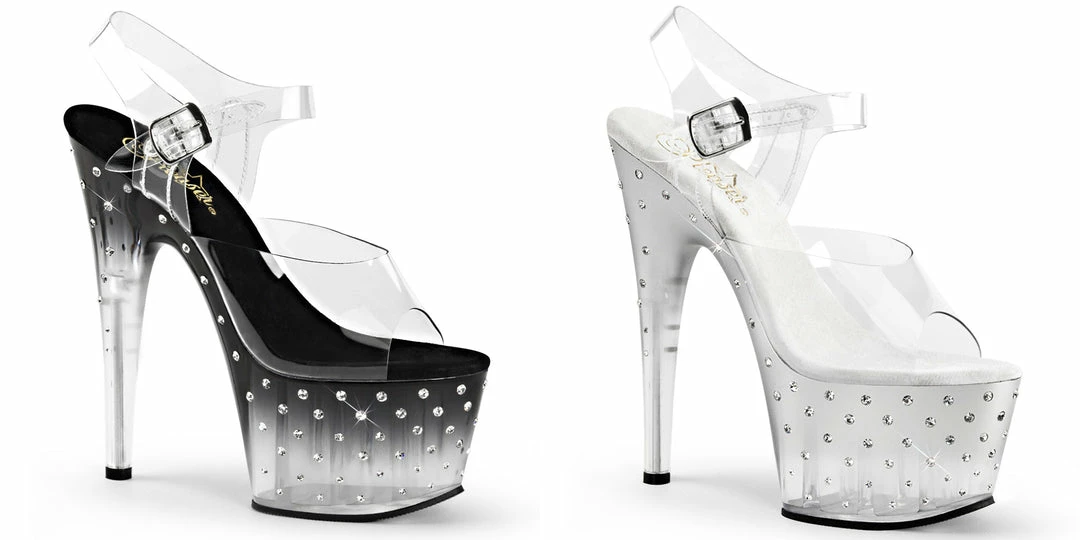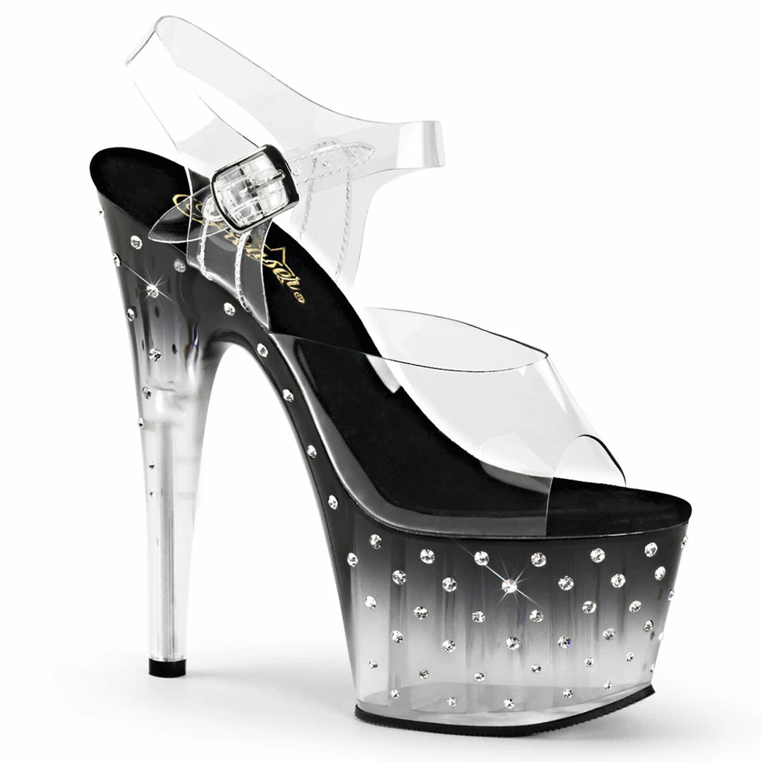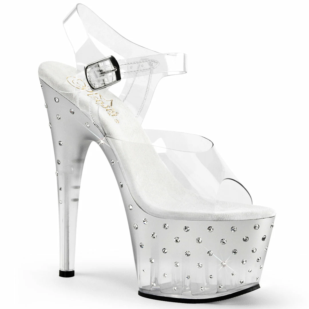 7″ (17.8cm) Heel, 2 3/4″ (7cm) Platform Ankle Strap Sandal Featuring Multi-size Rhinestones Studded on the Outer Side of the Tinted Platform