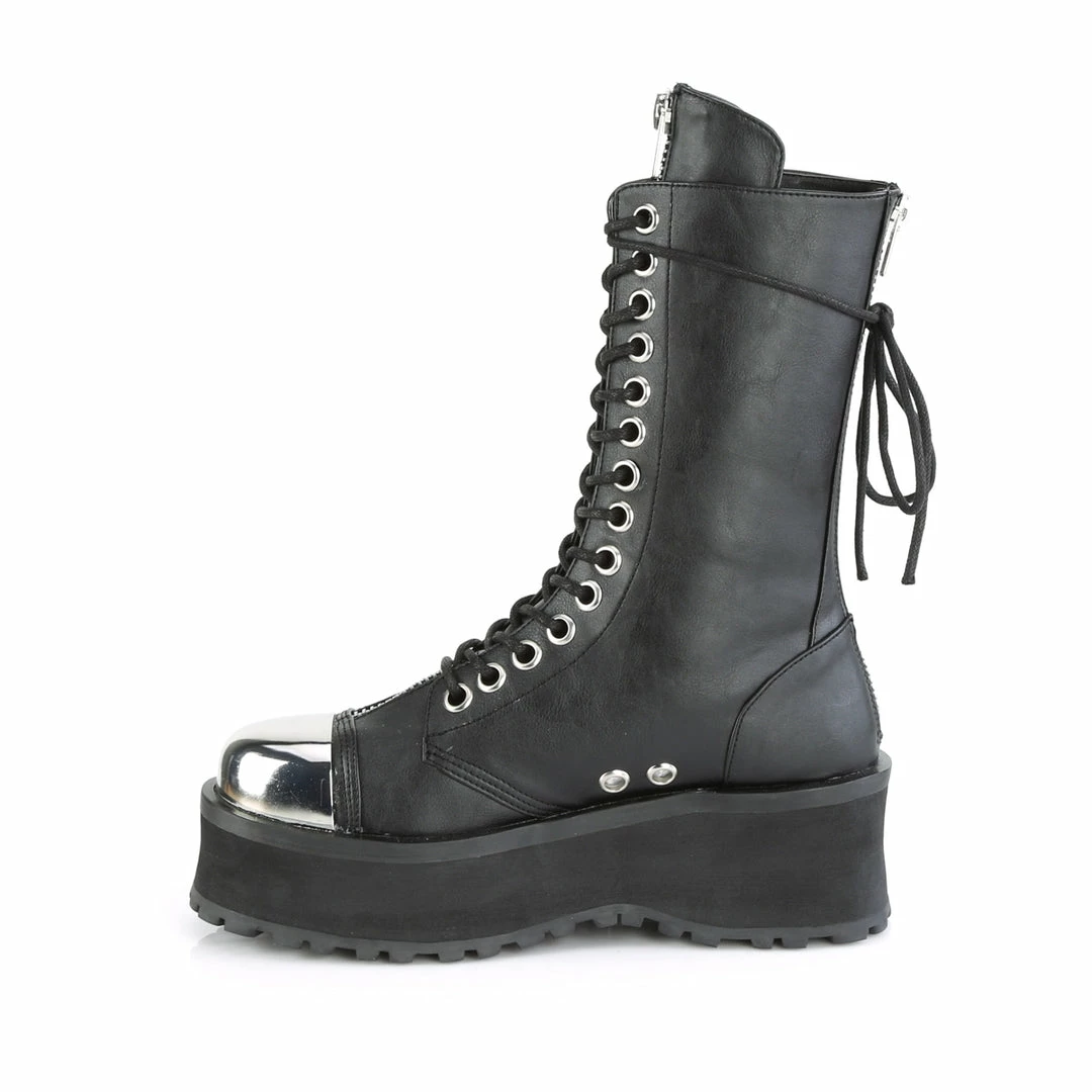 2 3/4″ (70mm) Platform Lace-Up Mid Calf Boot W/ Silver Chrome Plated Metal Toe Cap & Ornamental Zip Closure Details on the Tongue & Outer Side, Metal Back Zip Closure