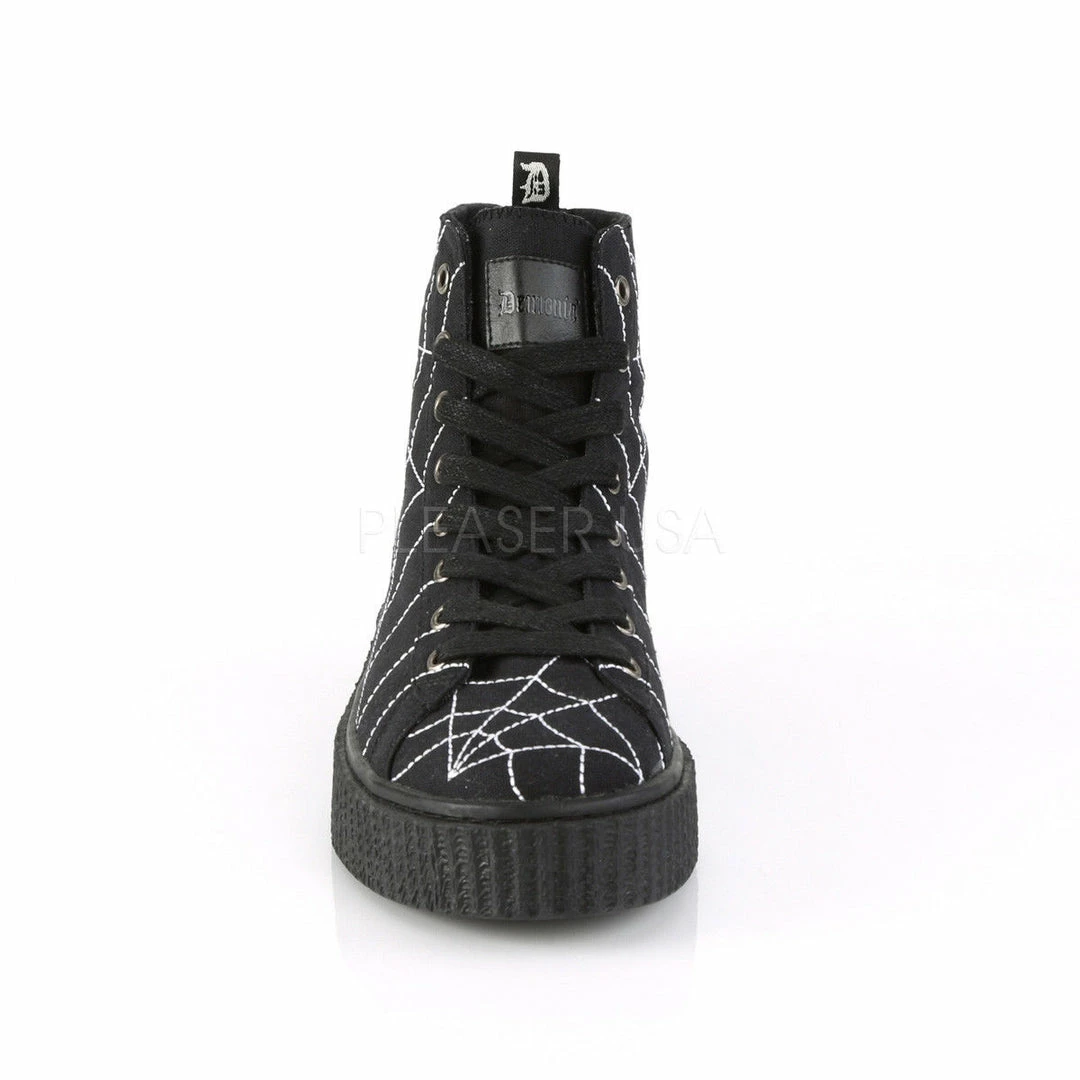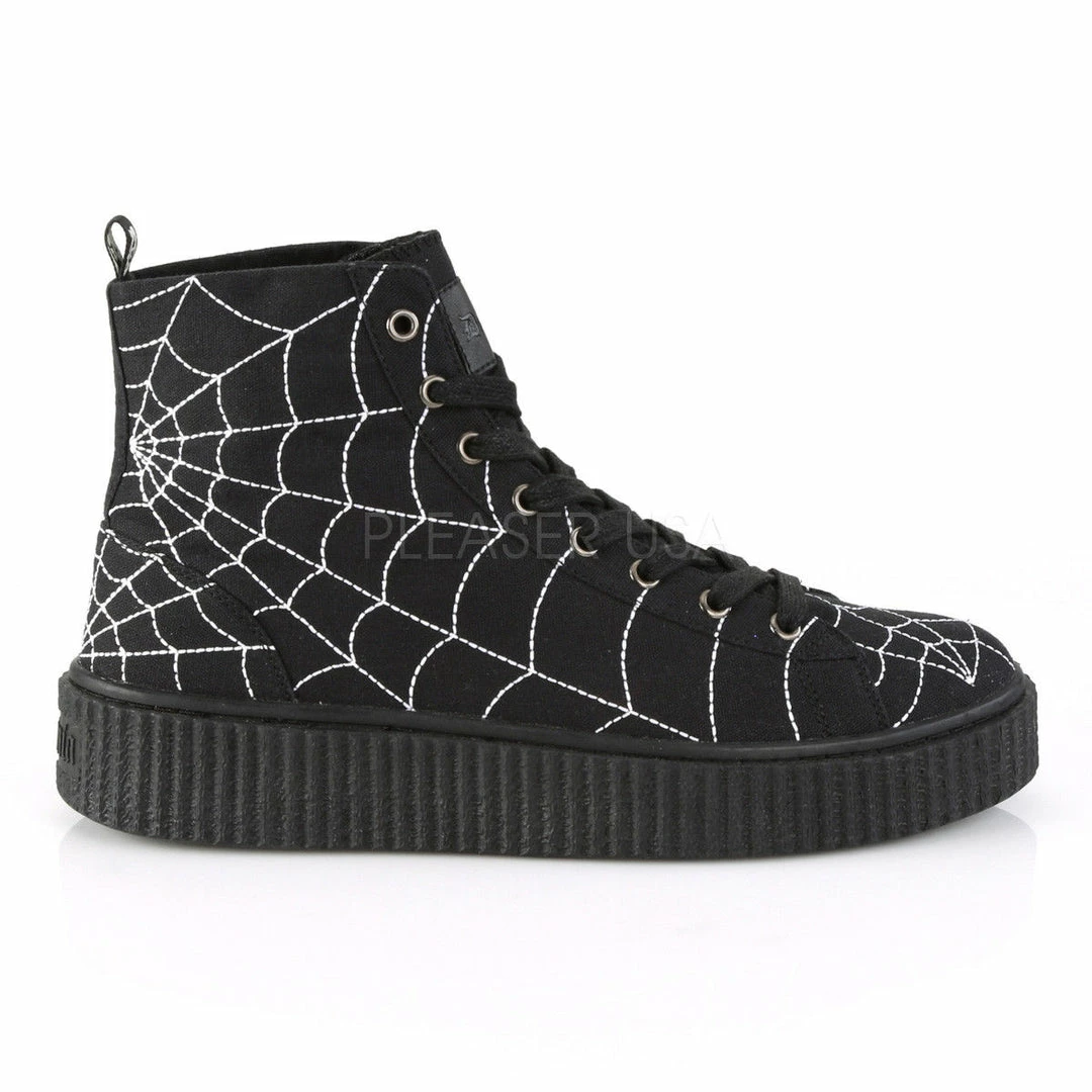 1 1/2″ (38mm) Platform Rubber Sole High Top Round Toe Lace-Up Front Creeper Sneaker Featuring Embroidered Spider Web Detail