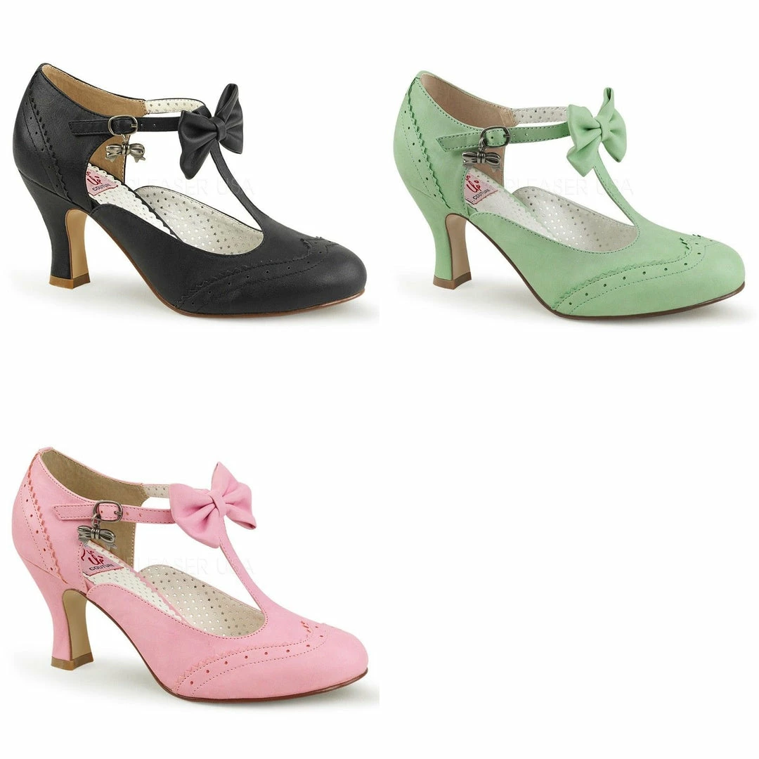 3″ (7.5cm) Kitten Heel Round Toe Wingtip T-Strap Pump with Bow & Bow Charm Detail