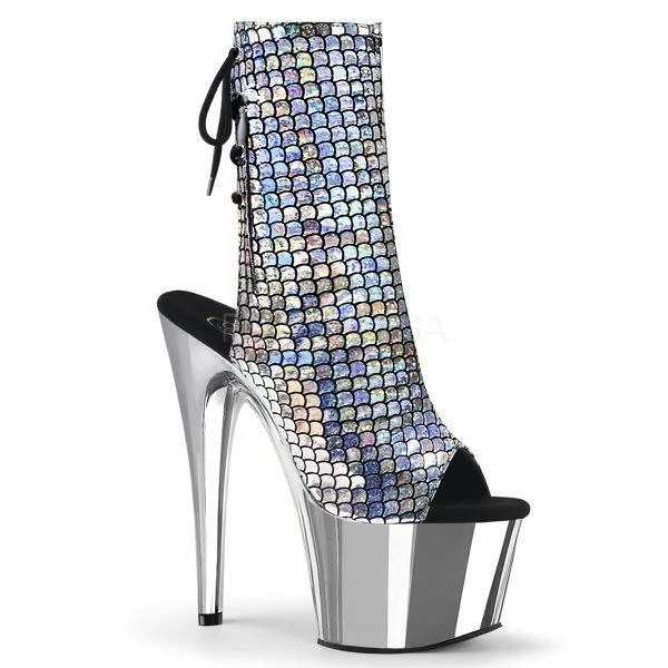 7″ (178mm) Heel, 2 3/4″ (70mm) Platform Open Toe/Heel Lace-Up Back Ankle Boot W/ Hidden Zip Pocket and Chrome Plated Platform Bottom, Inside Zip Closure