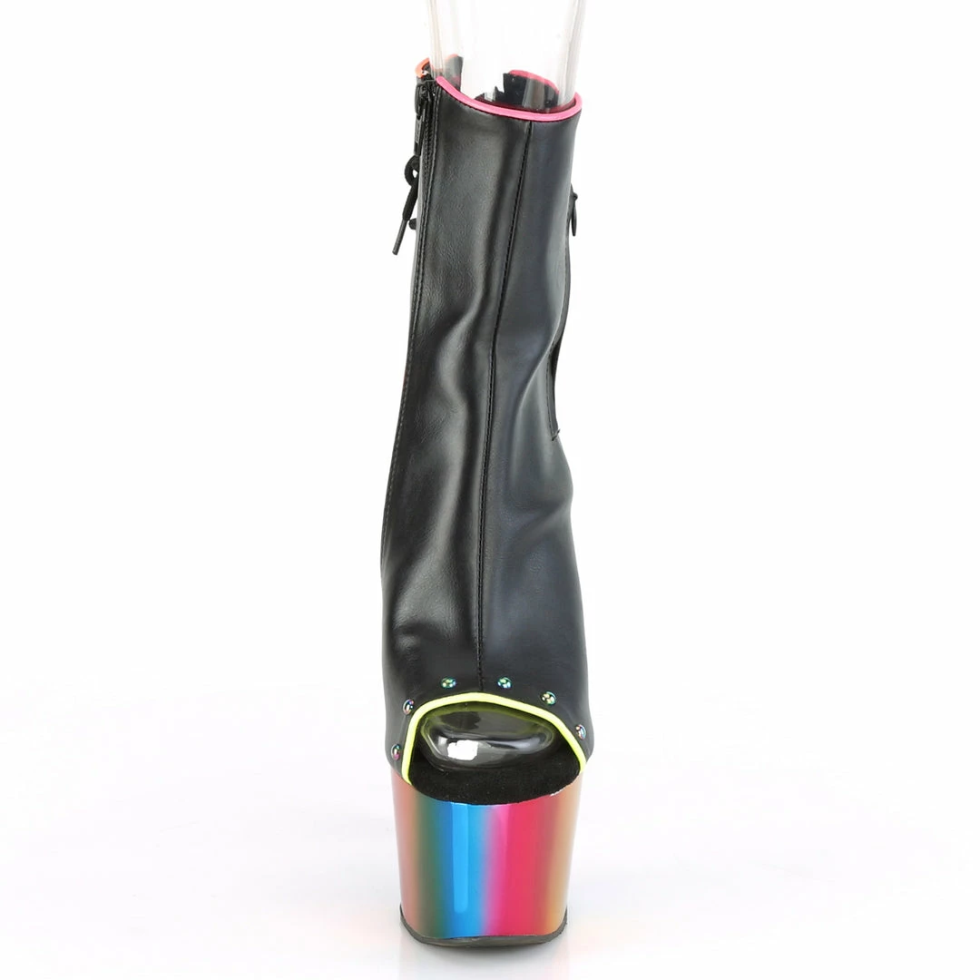 7″ (178mm) Heel, 2 3/4″ (70mm) Platform Open Toe/Heel Lace-Up Back Ankle Boot Featuring Blacklight Reactive Piping and Rainbow Chrome Plated Platform Bottom, Inside Zip Closure