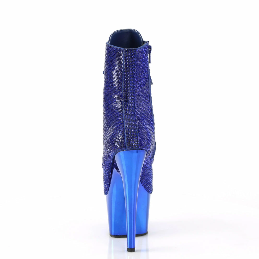 7″ (178mm) Heel, 2 3/4″ (70mm) Platform Lace-Up Front Ankle Boot Featuring Chrome Plated Platform Bottom and Allover Blanketed Rhinestone Embellishments on the Upper, Inside Zip Closure