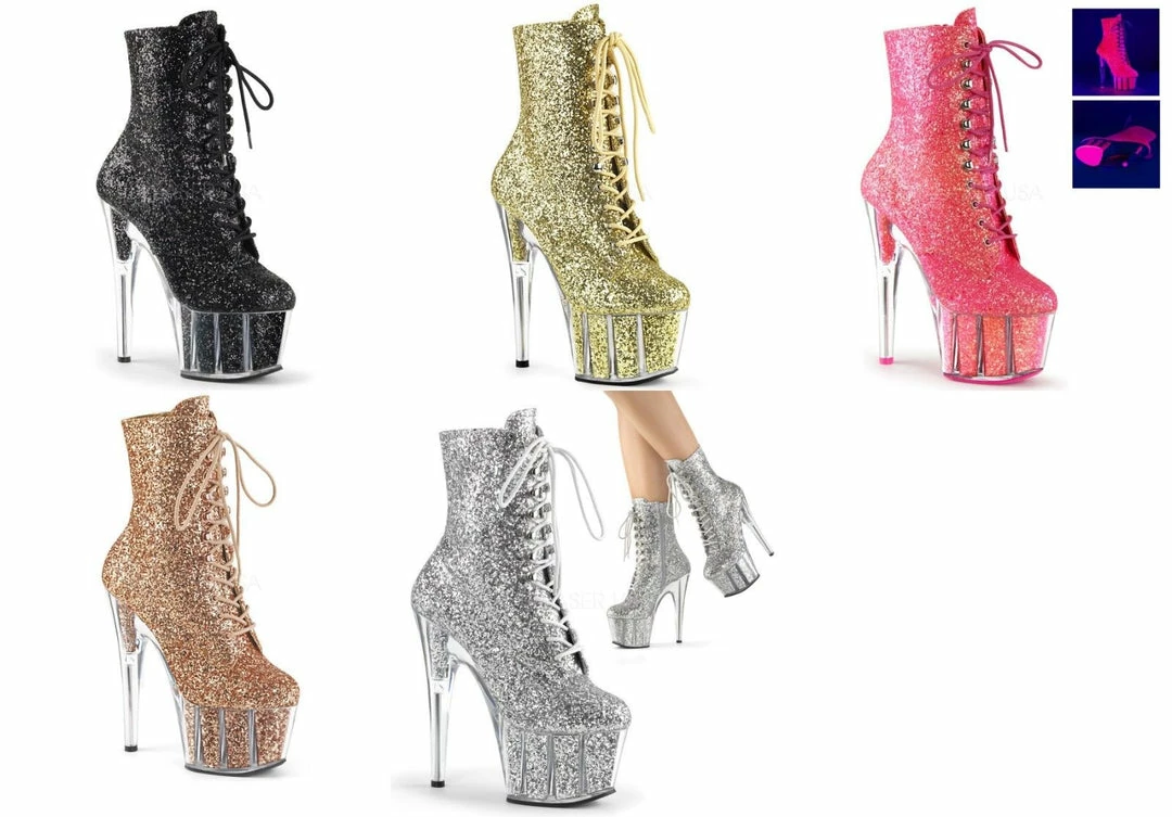 7″ (17.8cm) Stiletto Heel, 2 3/4″ (7cm) Glitter-filled Platform Front Lace-Up Ankle Boot Featuring Entire Upper and Outsole/Toplift Neon Blacklight Reactive, Inside Zip Closure