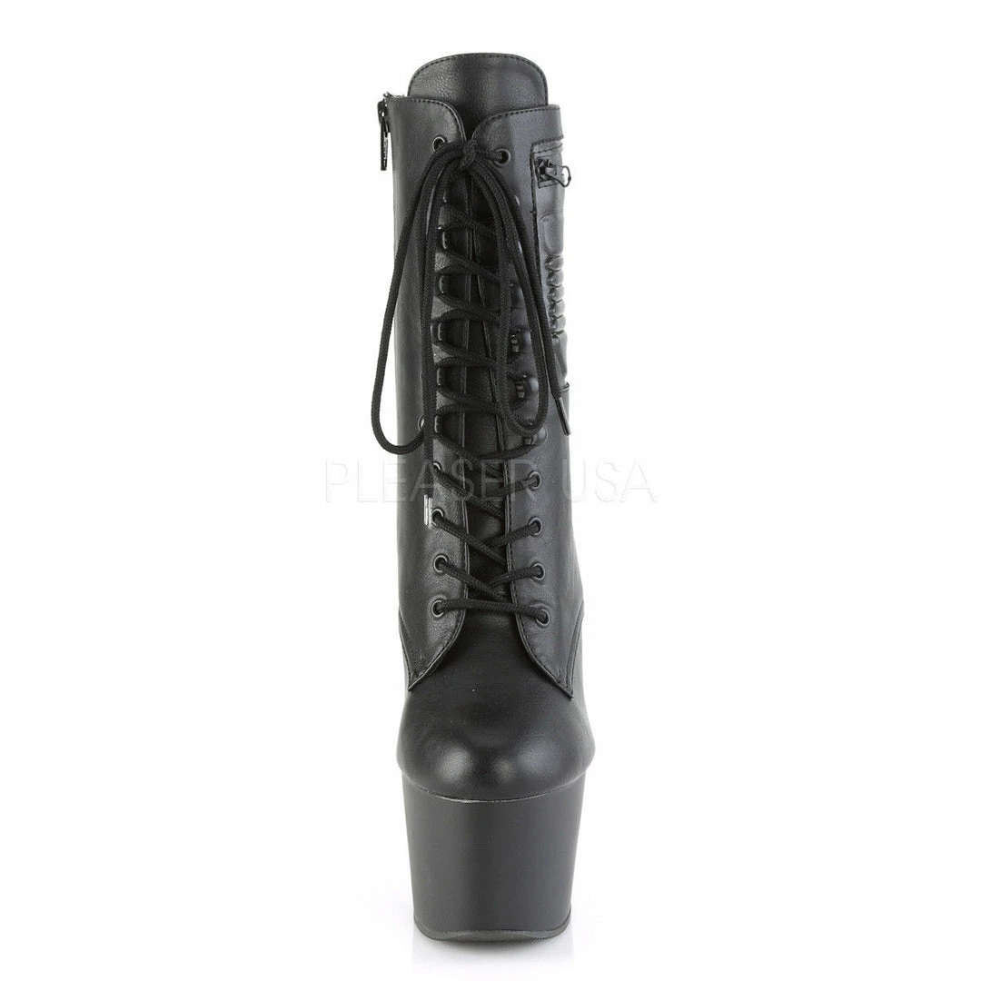 7″ (178mm) Heel, 2 3/4″ (70mm) Platform Lace-Up Front Ankle Boot w/ Outside Zippered Pocket, Full Inside Zip Closure