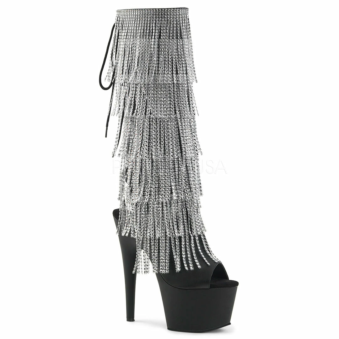 7″ (17.8cm) Stiletto Heel, 2 3/4″ (7cm) Platform Open Toe/Stiletto Heel Lace-Up Knee High Boot Featuring 6-Layer Simulated Rhinestone Fringe, Inside Zip Closure
