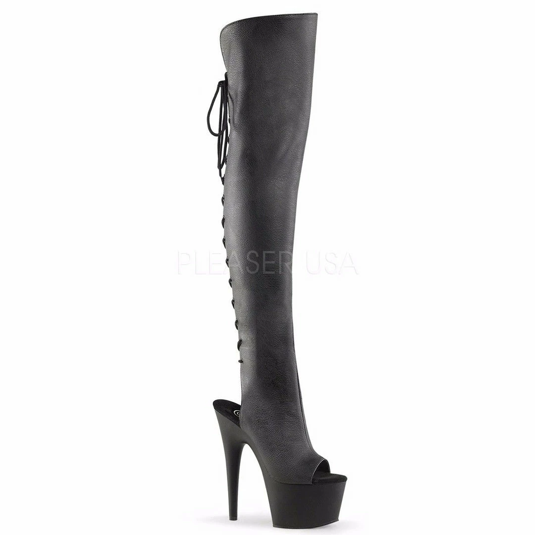 7″ (17.8cm) Stiletto Heel, 2 3/4″ (7cm) Platform Open Toe/Stiletto Heel Back Lace-Up Thigh High Boot, Full Side Zip Closure