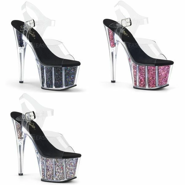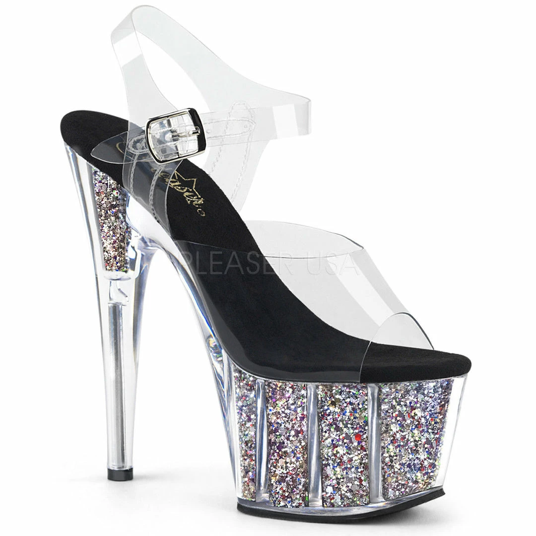 7″ (178mm) Heel, 2 3/4″ (70mm) Platform Ankle Strap Sandal w/ Confetti Glitter Inserts in the Platform Bottom