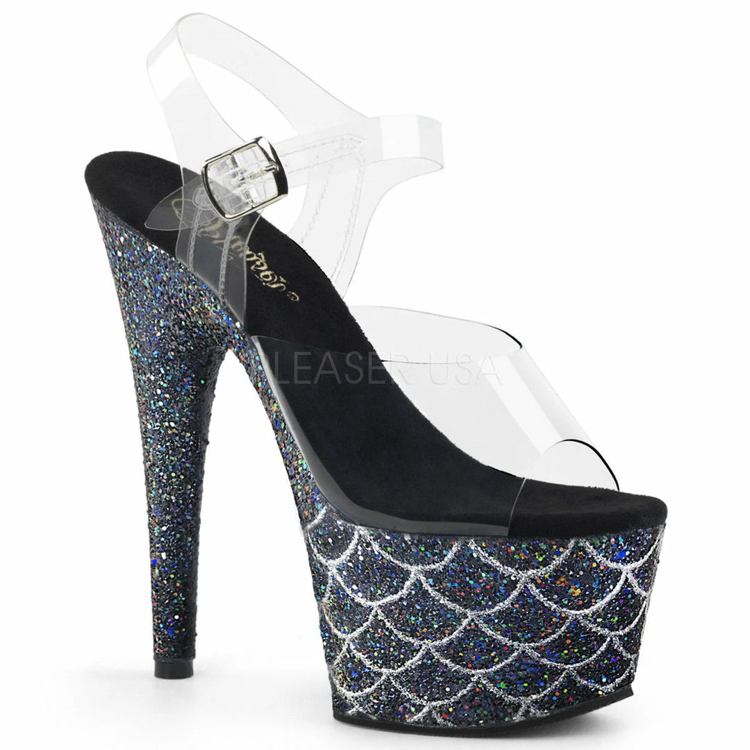 7″ (178mm) Heel, 2 3/4″ (70mm) Platform Ankle Strap Sandal Featuring Holographic Glitter Mermaid Scales Design on the Platform Bottom