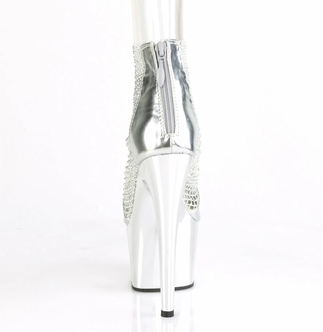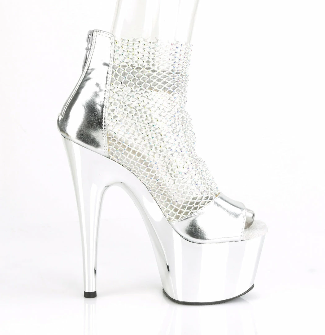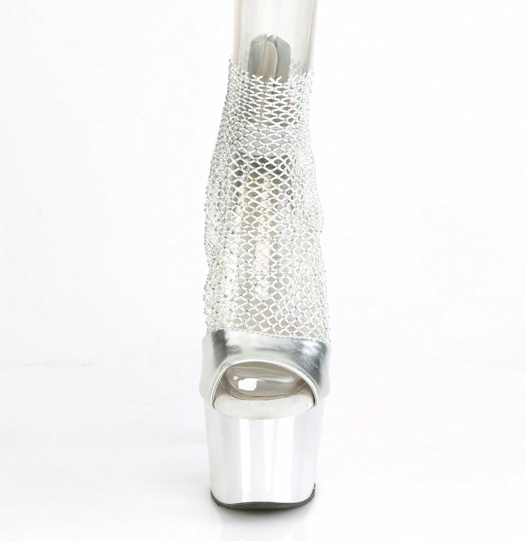 7″ (178mm) Heel, 2 3/4″ (70mm) Platform Close Back Shootie Sandal Featuring Stretchable AB Rhinestone Mesh Fabric Detail & Elastic Ankle Band, Back Zip closure