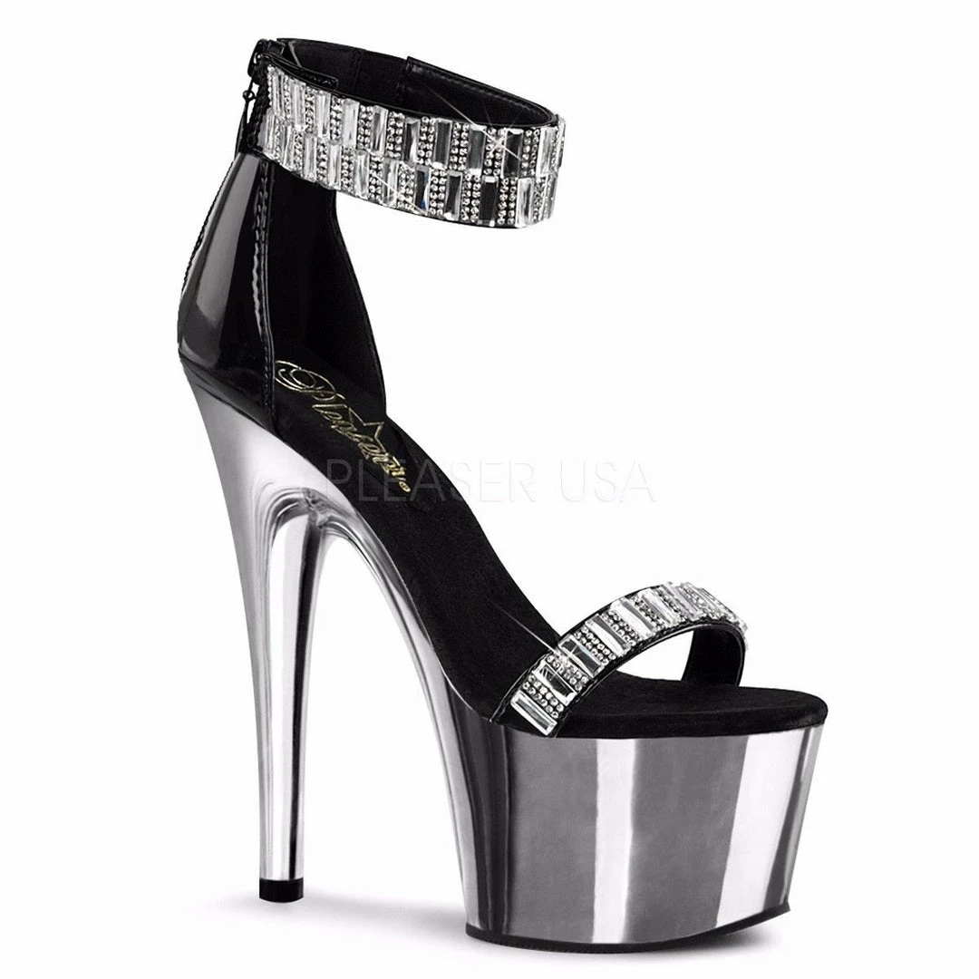 7″ (17.8cm) Stiletto Heel, 2 3/4″ (7cm) Chrome Plated Platform Closed Back Sandal Featuring Rhinestone and Mirrors Embellished All Over Ankle Cuff & Toe Strap, Back Zip Closure