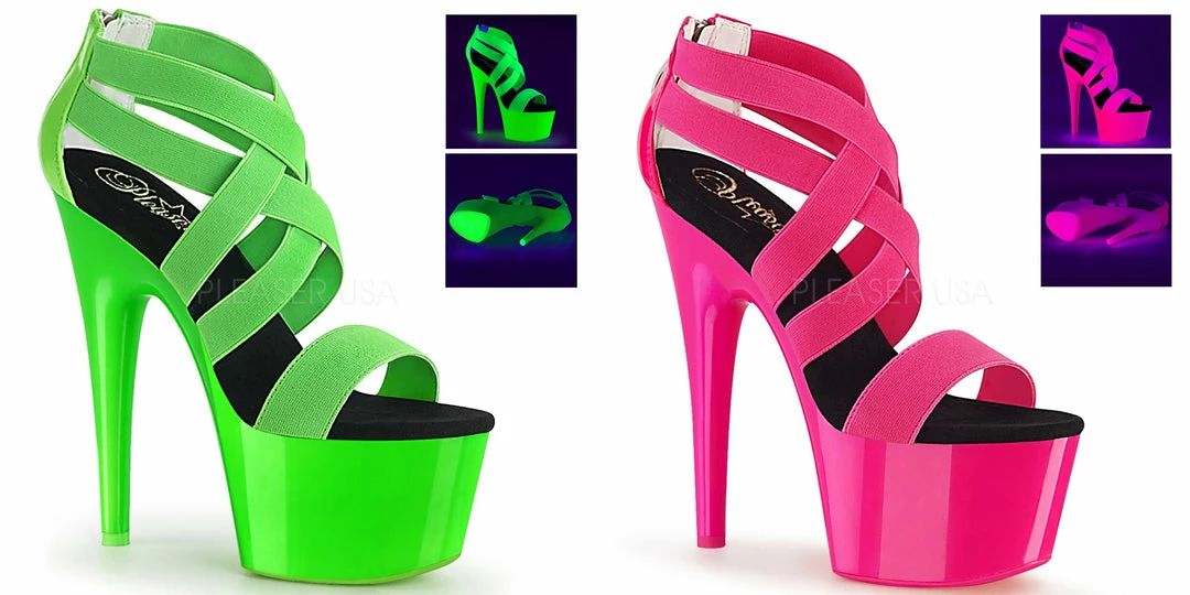 7″ (178mm) Heel, 2 3/4″ (70mm) Platform Criss Cross Sandal Featuring Entire Upper, Platform Bottom and Outsole/Toplift UV Blacklight Reactive