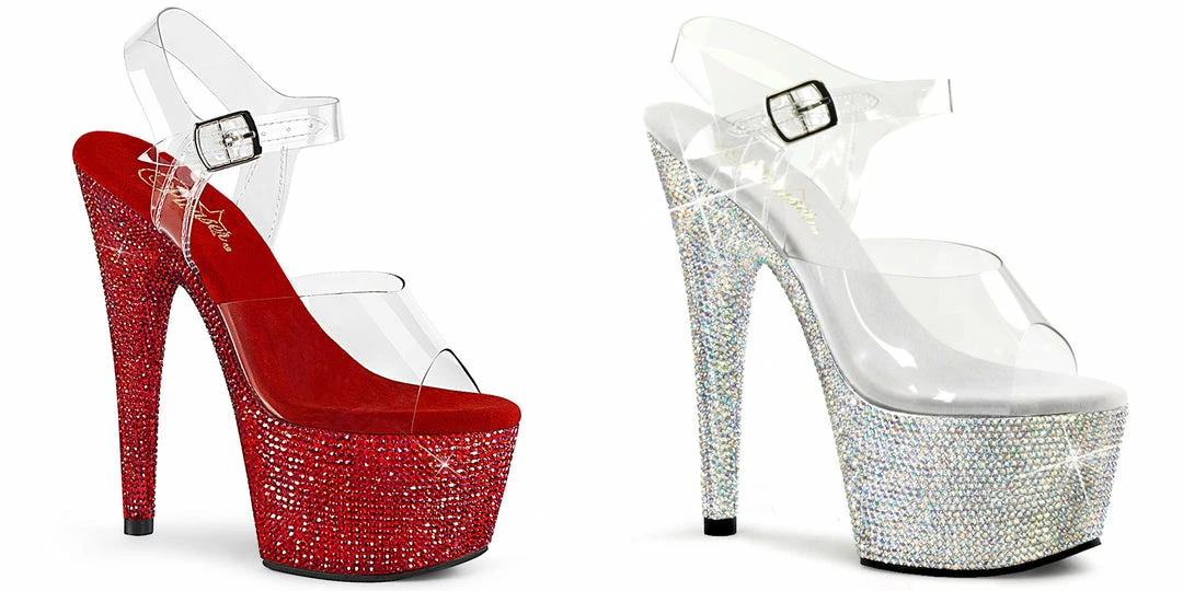 7″ (17.8cm) Heel, 2 3/4″ (7cm) Platform Ankle Strap Sandal Featuring Rhinestone Encrusted All-Over Platform