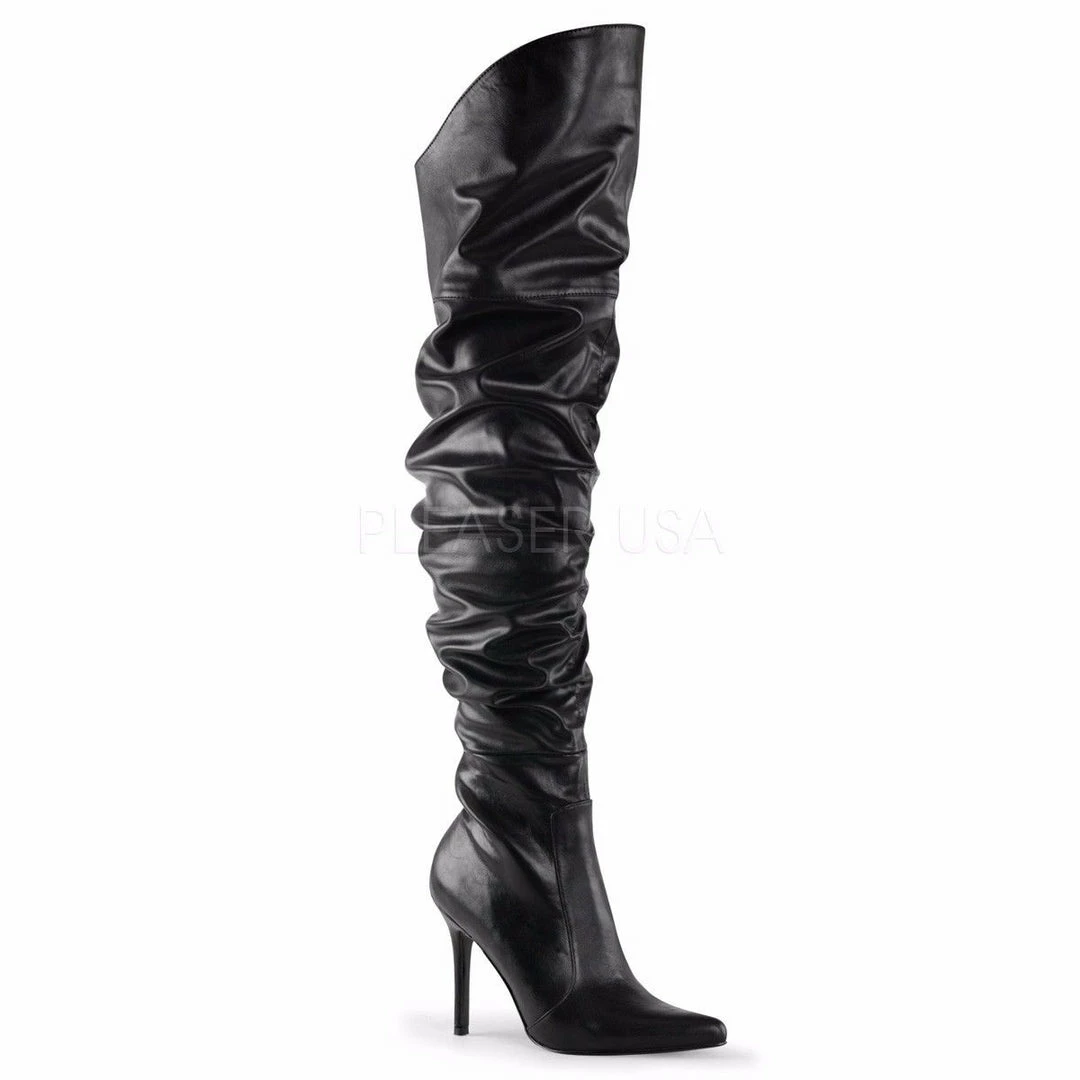 4″ (10.2cm) Sleek Stiletto Heel Thigh High Scrunch Boot Featuring Pointed Toe and Faux Fur Lining, 3/4 Inside Zip Closure