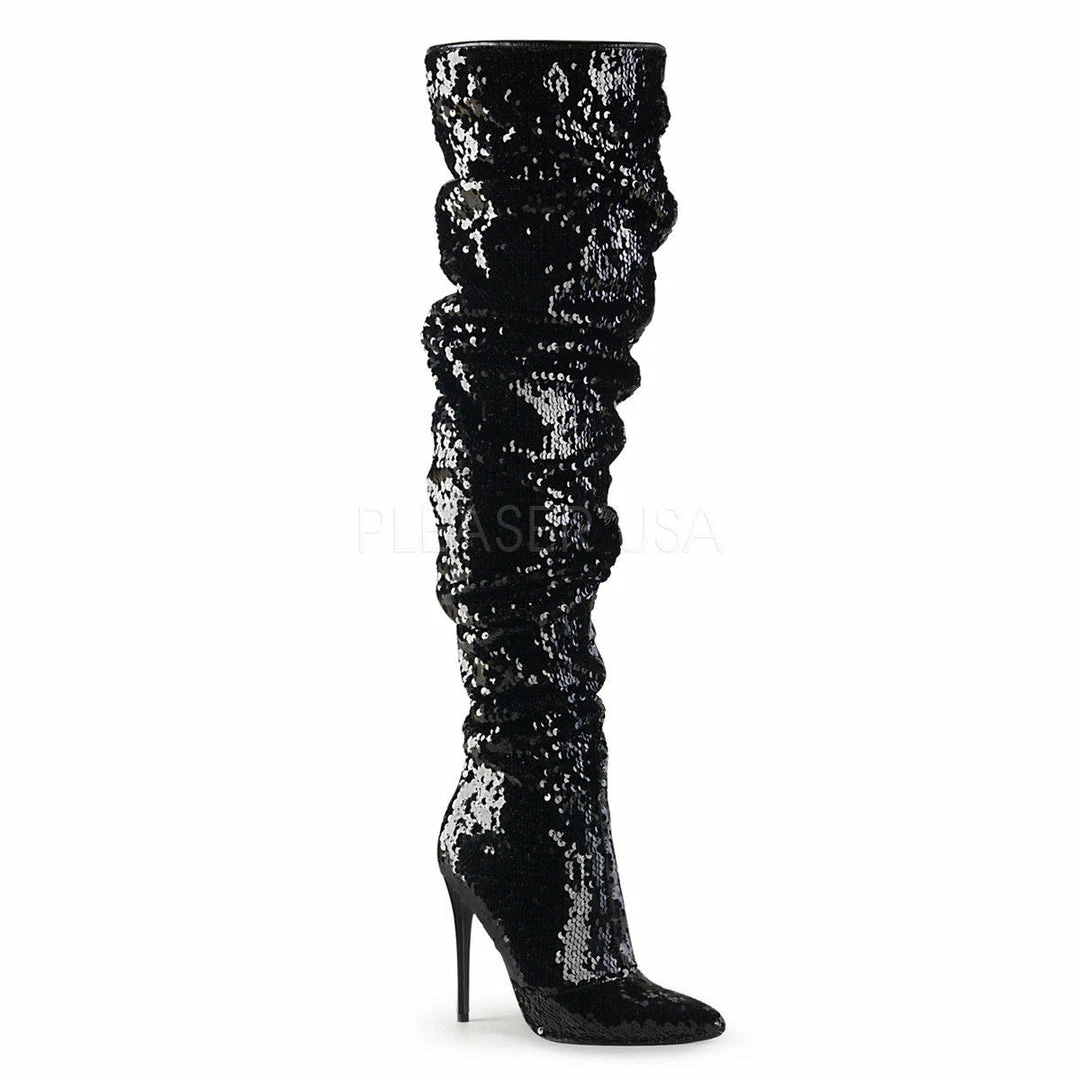 PLEASER Courtly-3011 Black Green Ruched Slouchy Sequins 5″ Heel Thigh High Boots