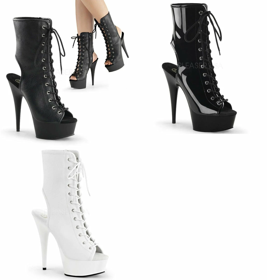 6″ (15.2cm) Stiletto Heel, 1 3/4″ (4.5cm) Platform Peep Toe, Open Heel Front Lace-Up Ankle Boot, Full-Length Inside Zip Closure
