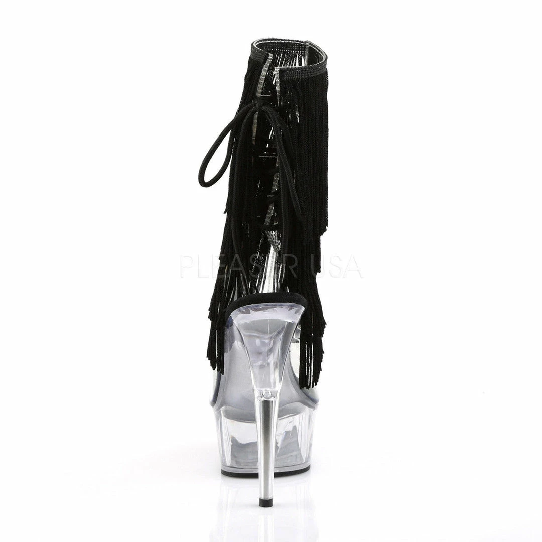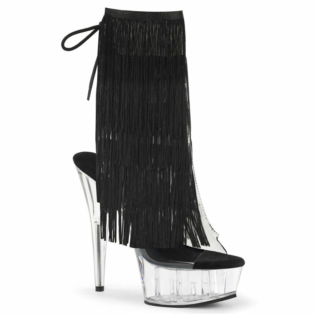 6″ (15.2cm) Stiletto Heel, 1 3/4″ (4.5cm) Platform Open Toe/Heel Back Lace-Up Ankle Boot Featuring 4-Layer Threaded Fringe