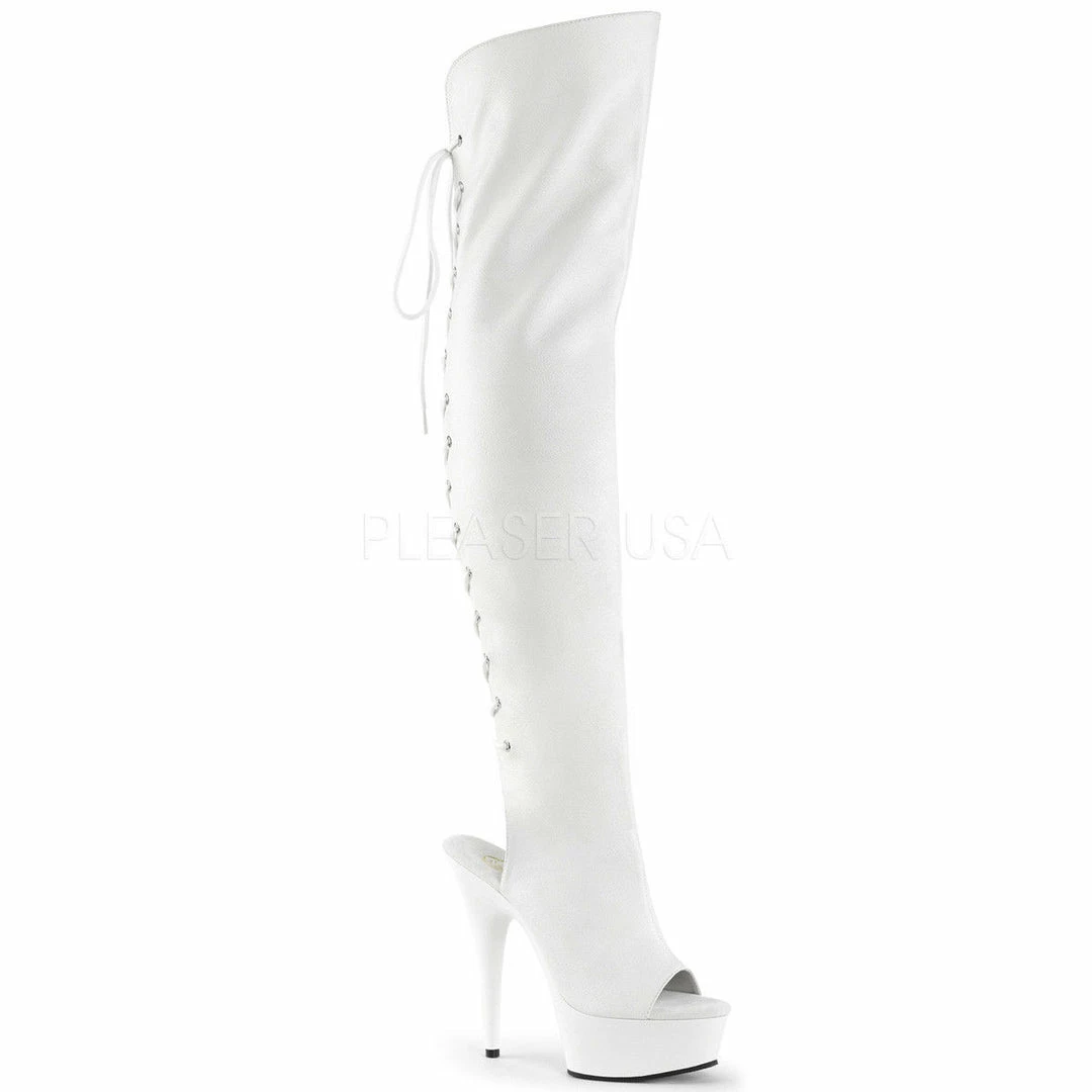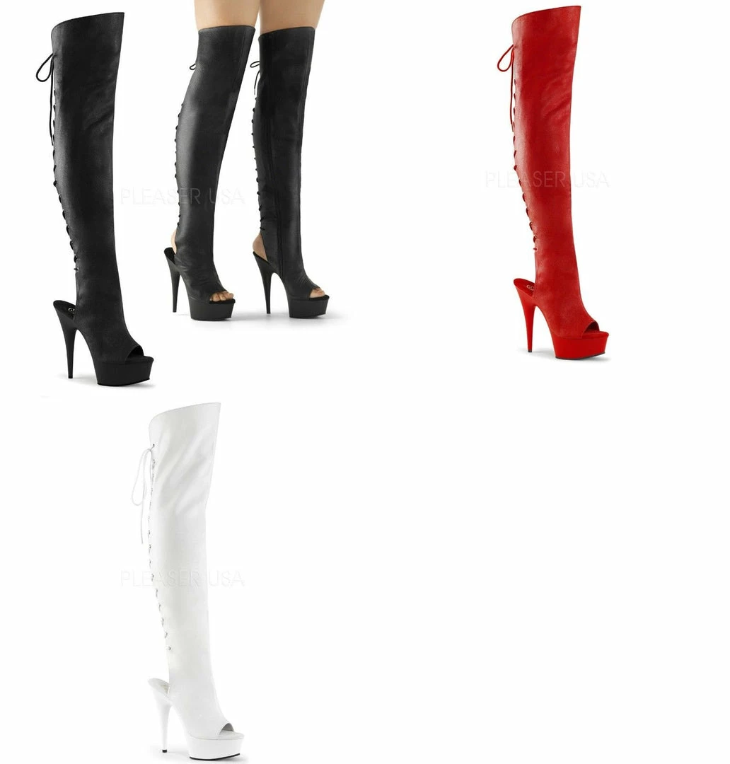 6″ (15.2cm) Stiletto Heel, 1 3/4″ (4.5cm) Platform Open Toe/Heel Lace-Up Back Thigh High Boot, , Full Inner Side Zipper
