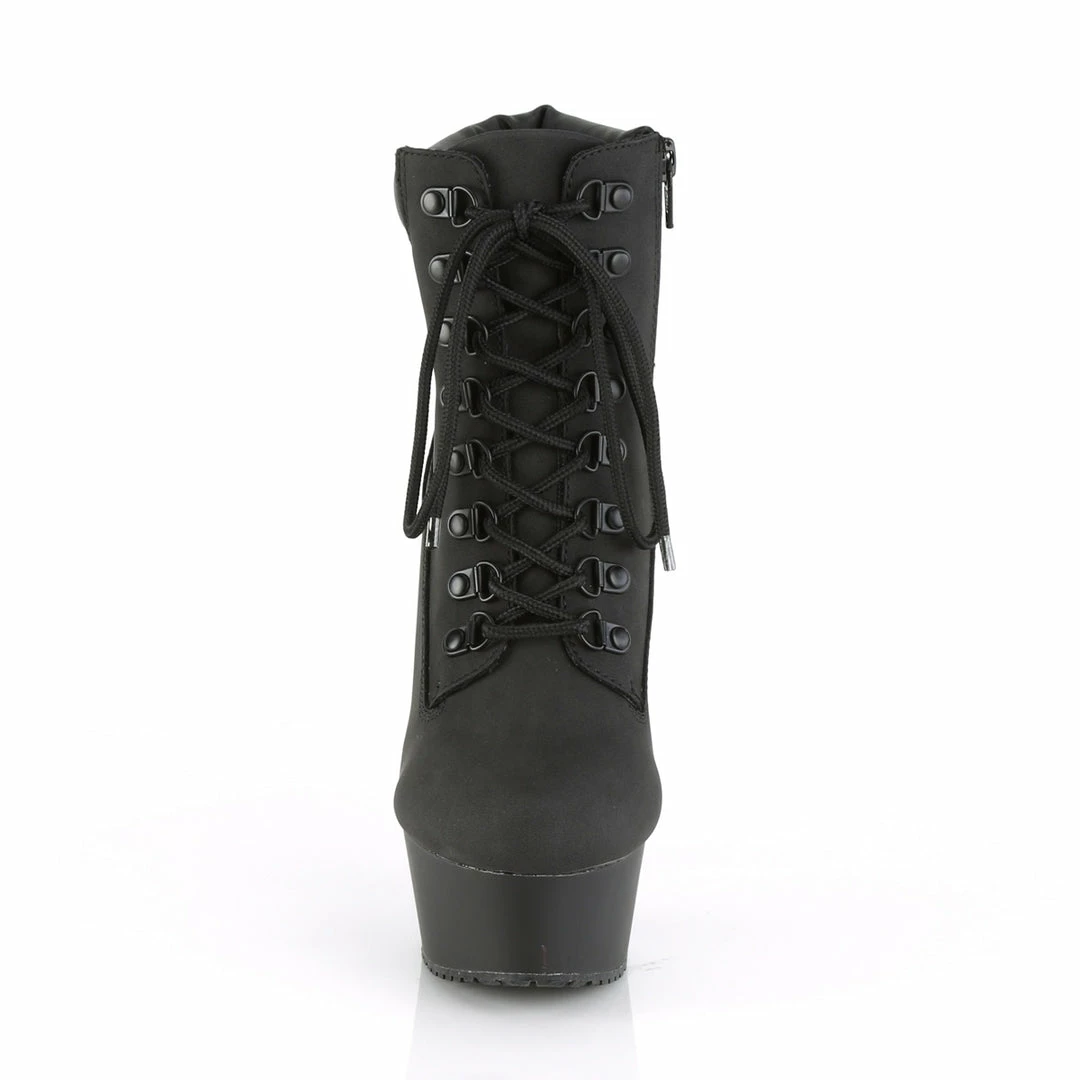 6″ (152mm) Heel, 1 3/4″ (45mm) Platform Lace-up Front Bootie Featuring Padded Collar & Rubber Lug Outsole, Inside Zip Closure