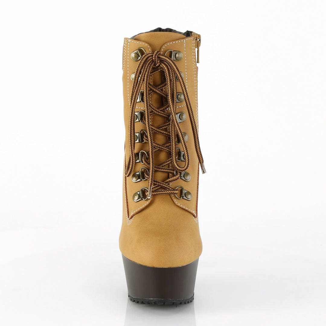 6″ (152mm) Heel, 1 3/4″ (45mm) Platform Lace-up Front Bootie Featuring Padded Collar & Rubber Lug Outsole, Inside Zip Closure