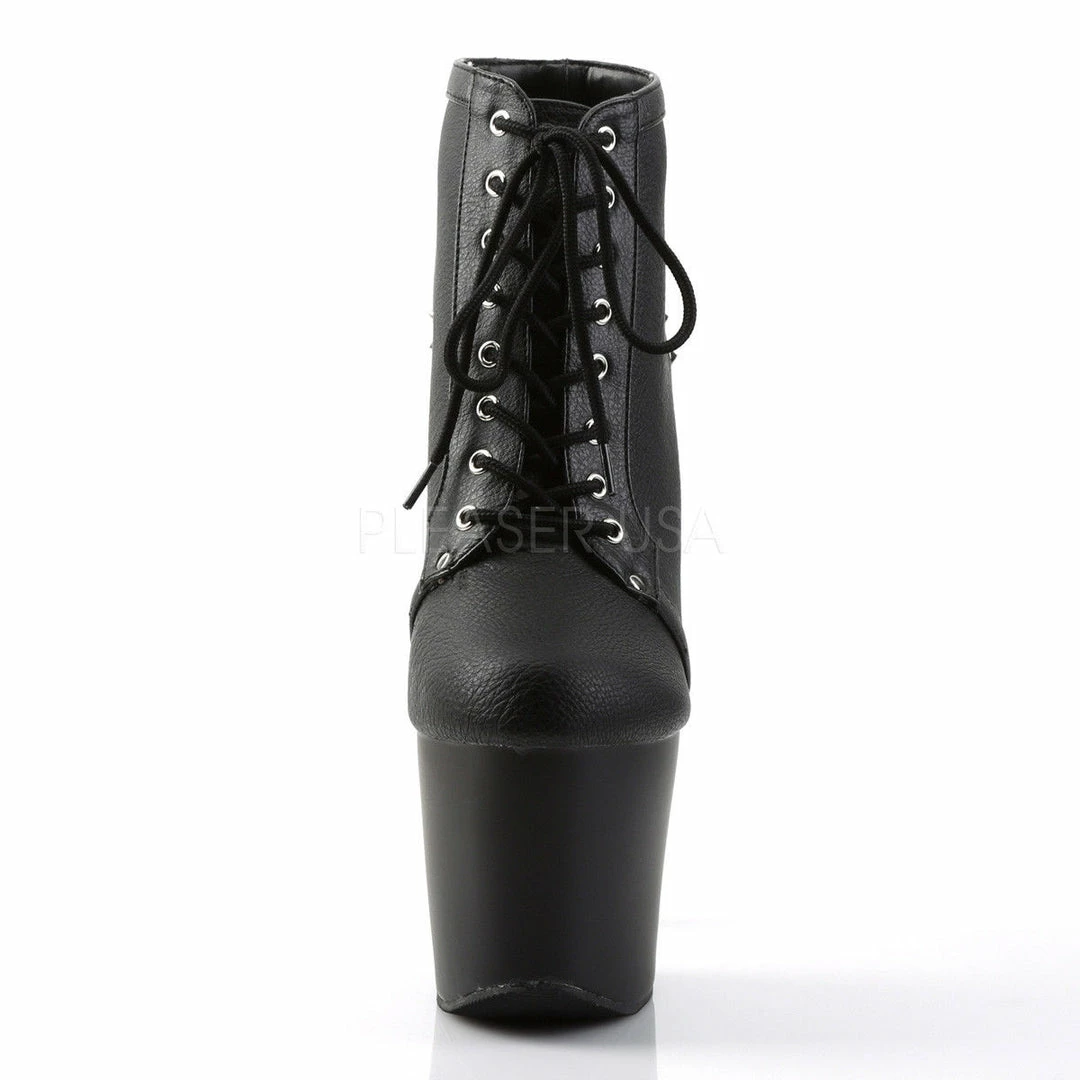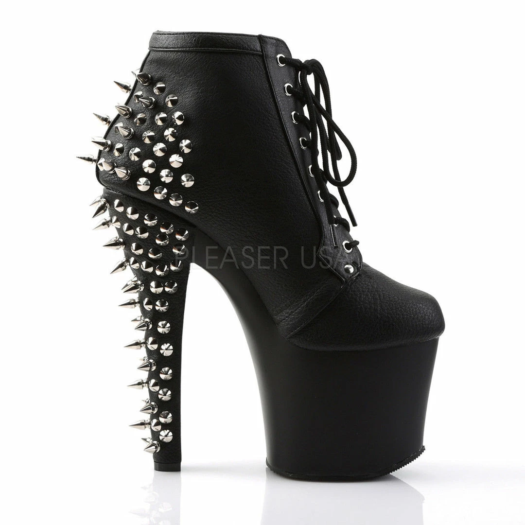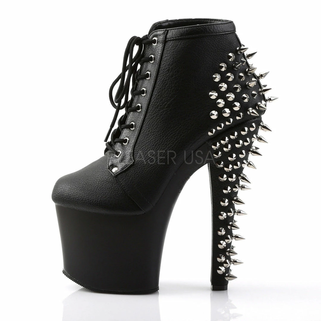 7″ (17.8cm) Stiletto Heel, 2 3/4″ (7cm) Platform Lace Up Ankle Bootie Featuring Spikes and Stones Adorning Heel & Back of Shoes