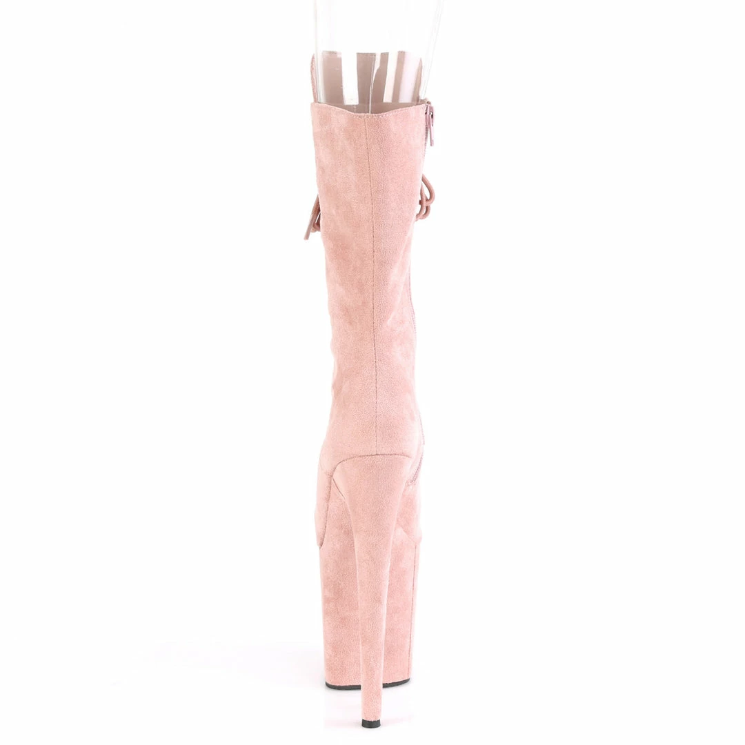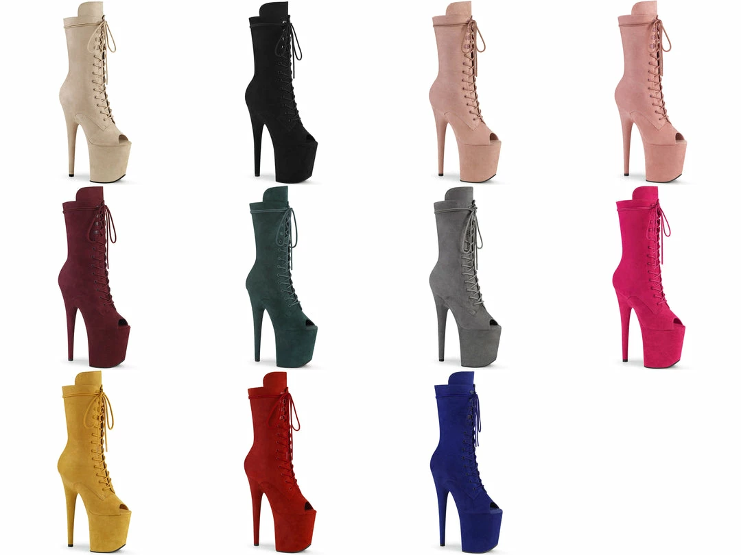 8″ (200mm) Heel, 4″ (100mm) Platform Peep Toe Lace-Up Front Mid Calf Boot Featuring Fully Wrapped Platform Bottom. With Matching & Black Shoe Laces, Inside Zip Closure