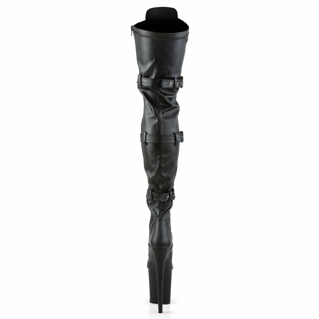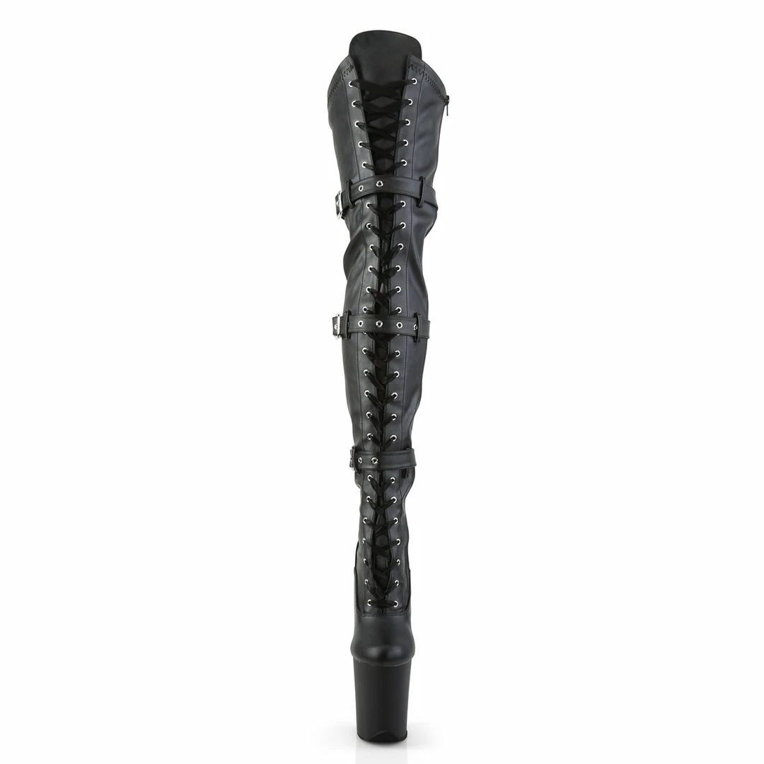 8″ (20.3cm) Stiletto Heel, 4″ (10.2cm) Platform Lace-Up Front Stretch Thigh High Boot with Straps & Belt Buckle Detail, Full-Length Inside Zip Closure
