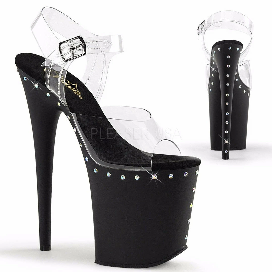 8″ (20.3cm) Stiletto Heel, 4″ (10.2cm) Platform Ankle Strap Sandal Featuring AB Lined Rhinestones on the Platform