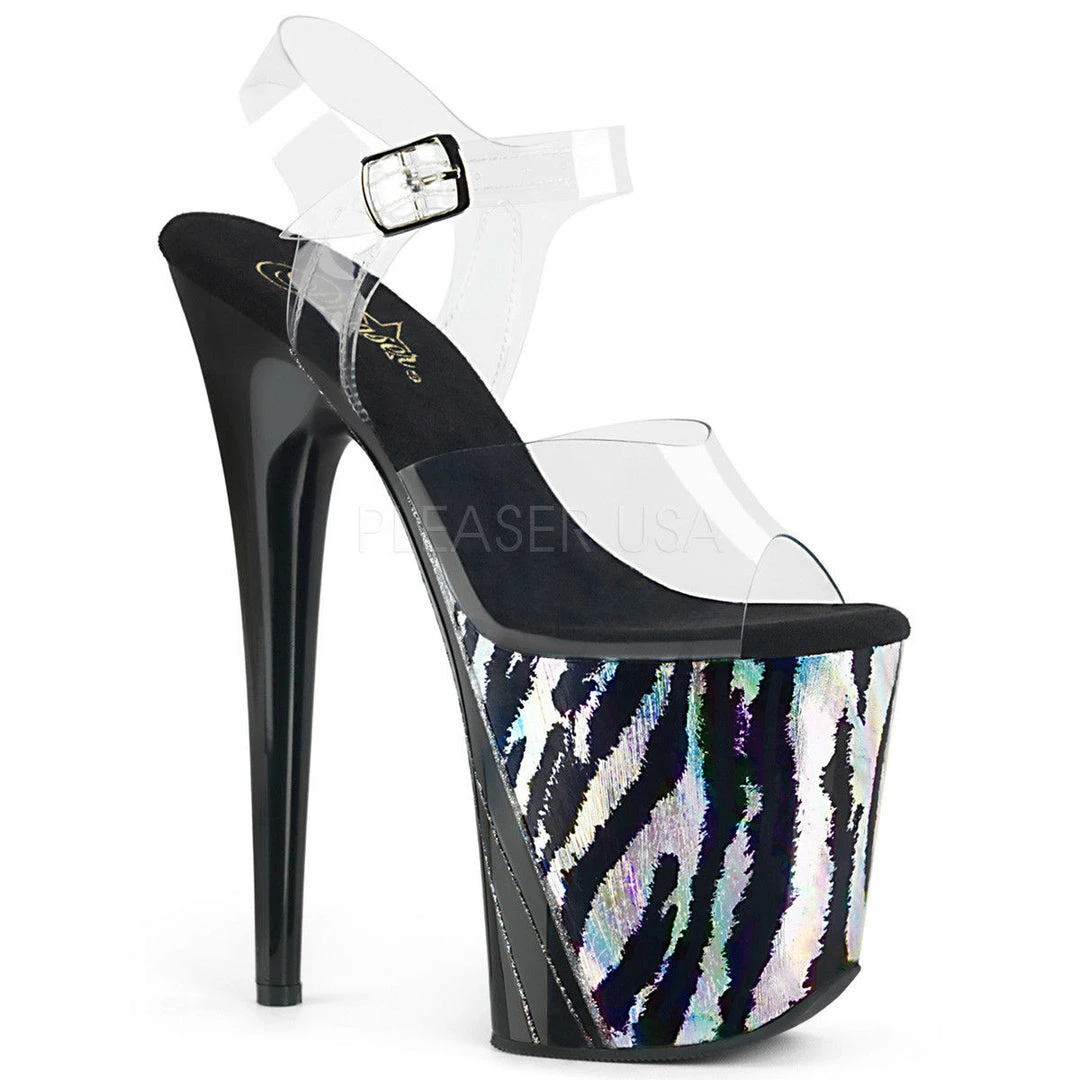 8″ (200mm) Heel, 4″ (100mm) Platform Ankle Strap Sandal w/ Holographic Zebra Print on the Platform Bottom