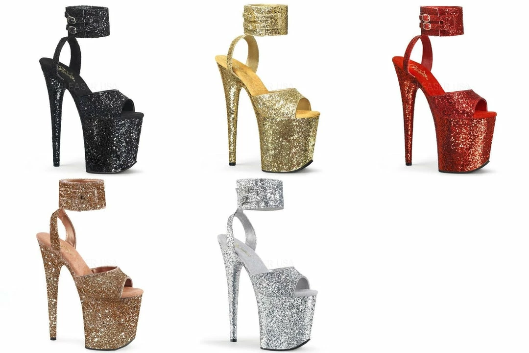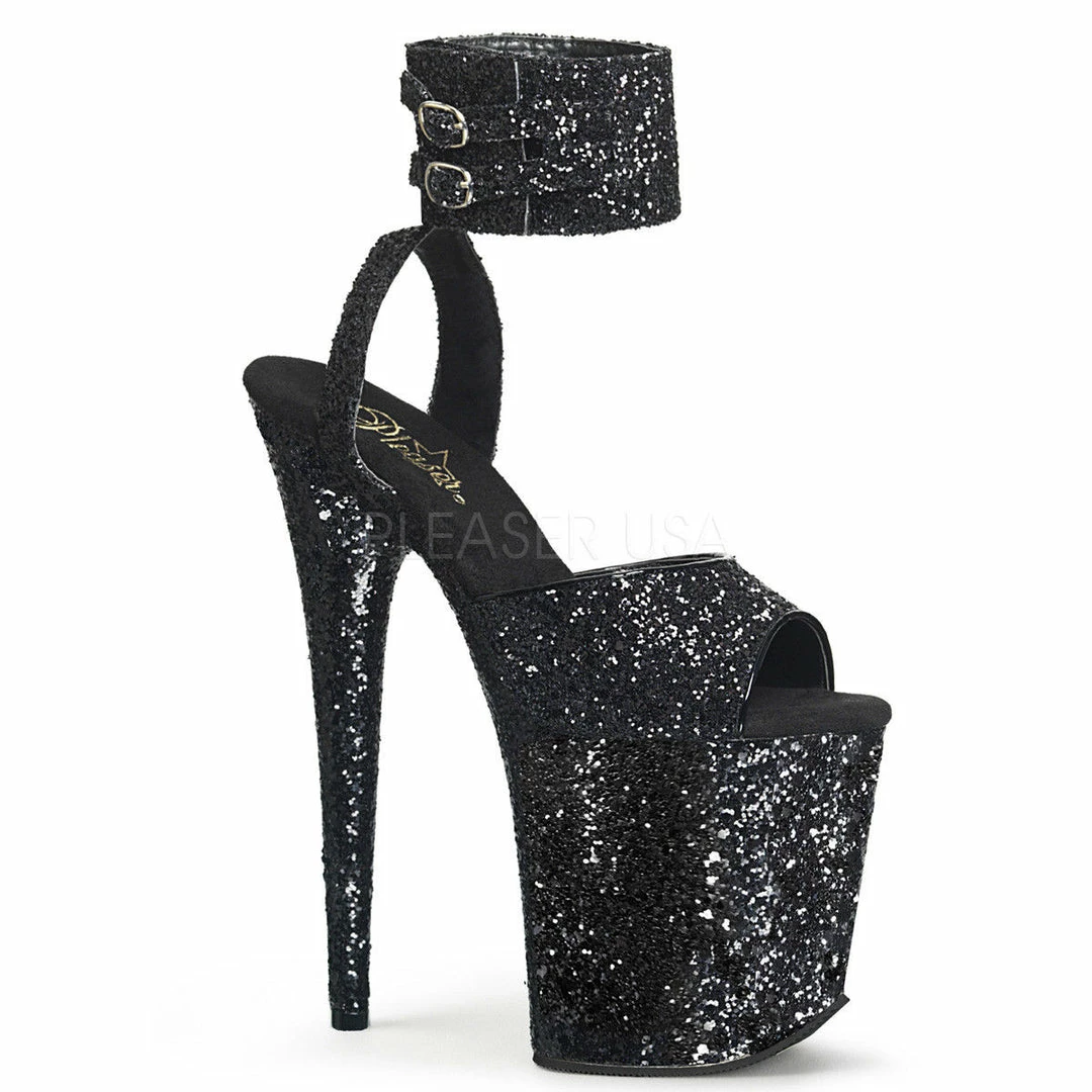 8″ (203mm) Heel, 4″ (102mm) Platform Glitter Ankle Strap Sandal Featuring Wide Ankle Band W/ Dual Buckle Straps