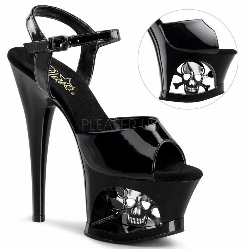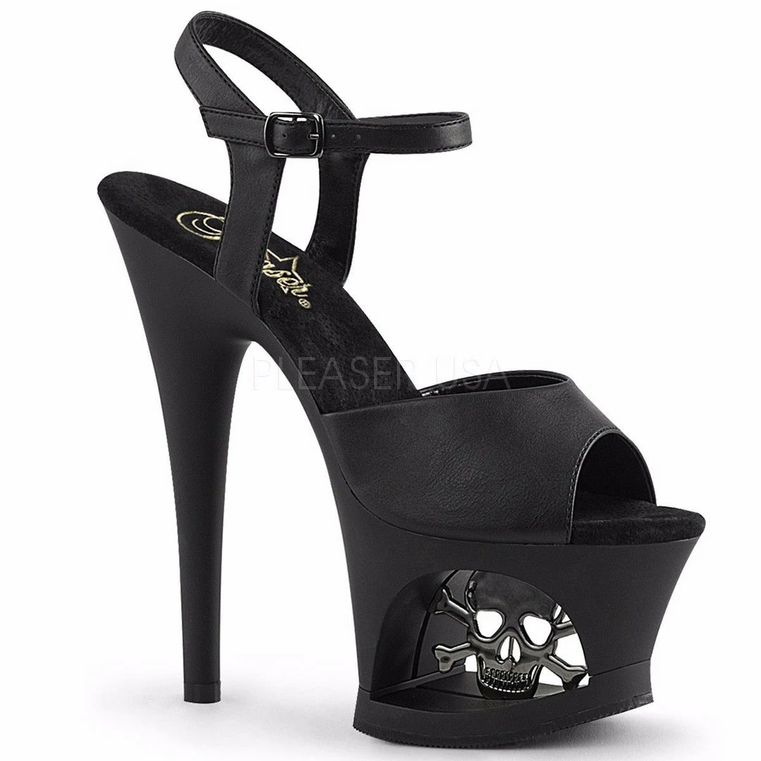 7″ (17.8cm) Heel, 2 3/4″ (7cm) Cut-Out Platform Ankle Strap Sandal Featuring Skull & Cross Bones In the Platform