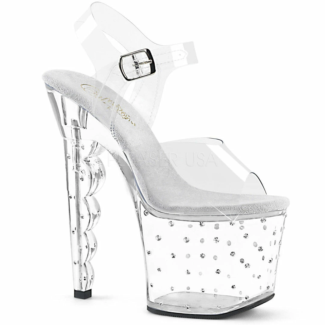 7″ (178mm) Scalloped Heel, 3 1/4″ (83mm) Platform Ankle Strap Sandal Featuring Multi-Size Rhinestones Studded on the Heel and Outer Side of the Platform