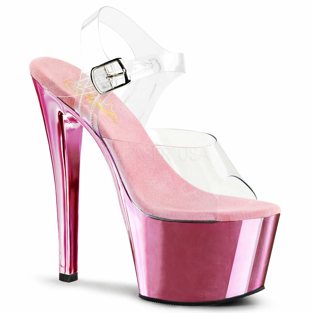 7″ (17.8cm) Heel, 2 3/4″ (7cm) Platform Ankle Strap Sandal with Chrome Plated Bottom