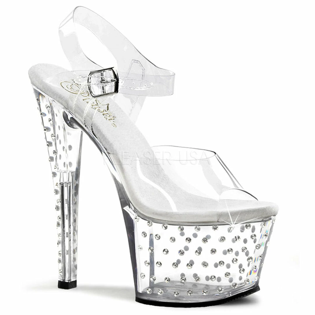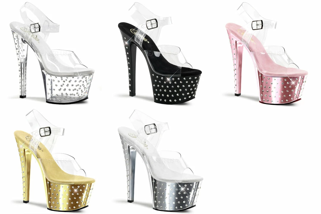 7″ (17.8cm) Heel, 2 3/4″ (7cm) Platform Ankle Strap Sandal Featuring Rhinestone Studded Chrome Bottom